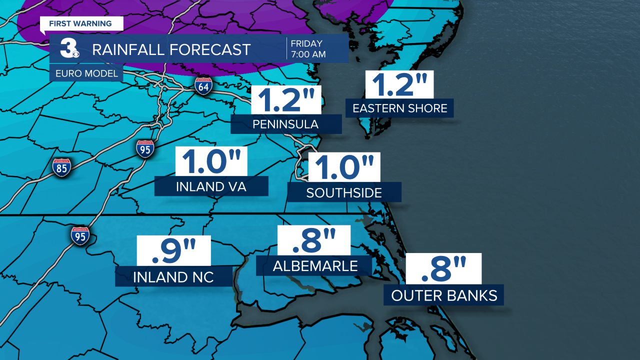Longer-range forecast models are painting in close to an inch of rain. We could even hear a few rumbles of thunder, and it will be windy as well. The trade-off: high temperatures near 60°!