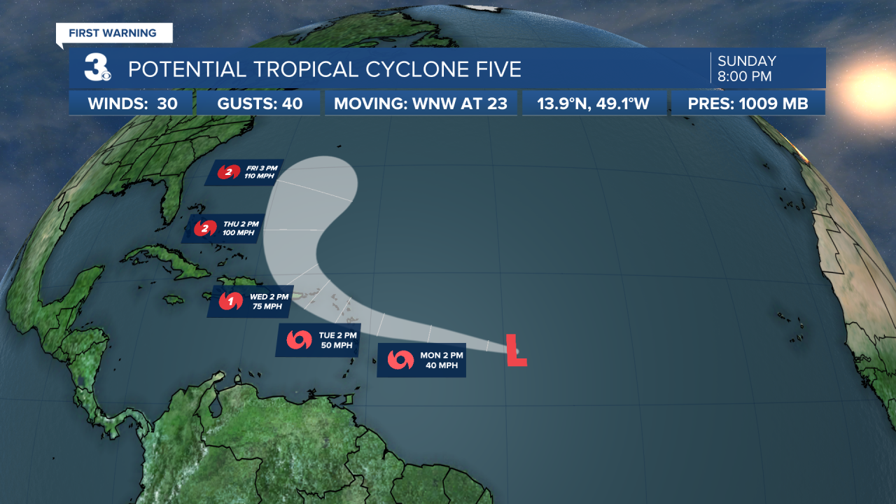 We’re monitoring a broad area of low pressure associated with a tropical wave out in the Atlantic. Satellite images show a broad area of circulation, but the system lacks a well-defined center. The disturbance is forecast to become a tropical storm within the next day or so. As it continues moving west northwestward it is expected to strengthen into a hurricane. Models show the system staying out to sea due to an approaching cold front.