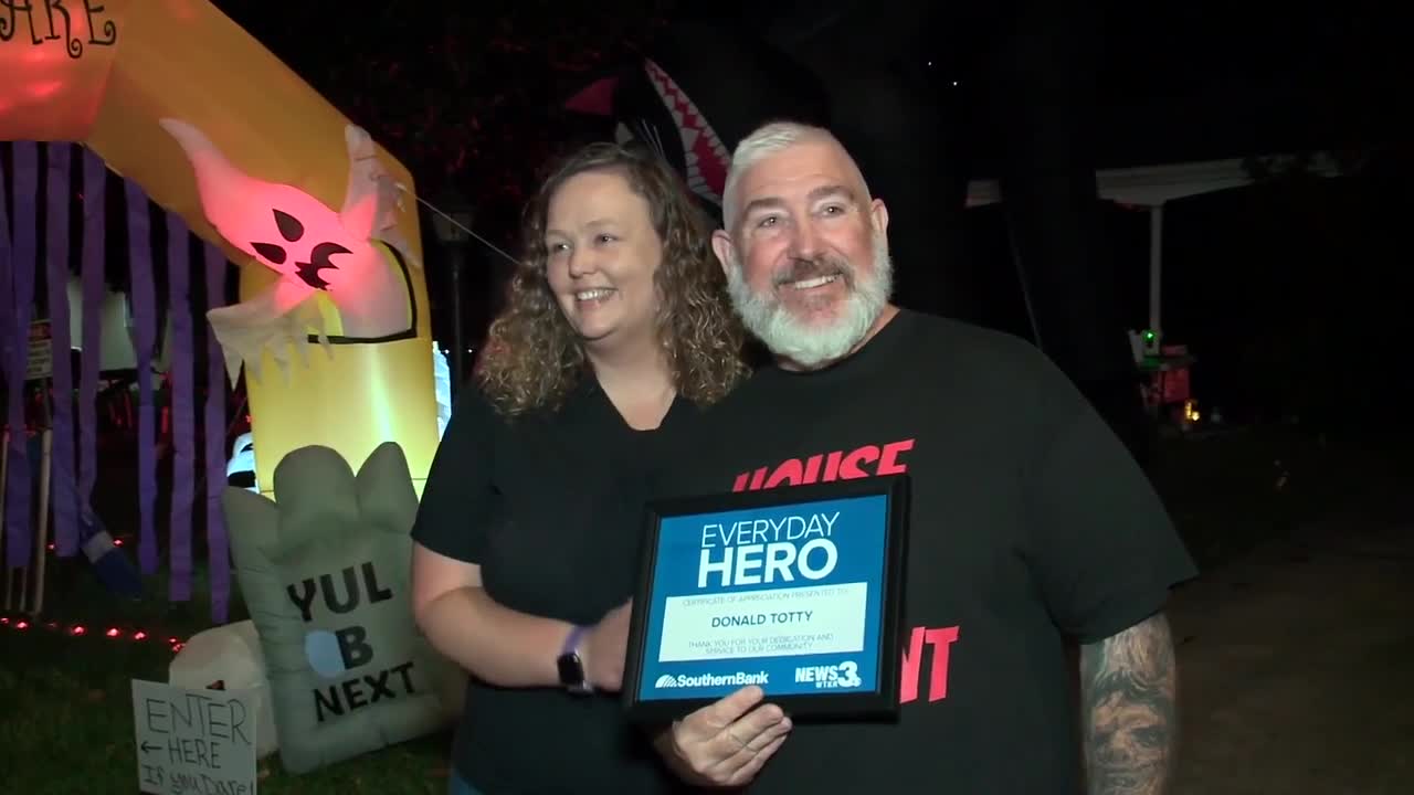 Rios stood by Totty's side as he accepted this week's News 3 Everyday Hero award, including a $300 Visa gift card from our partner Southern Bank. A group of scarily-dressed ghouls and goblins broke out into applause.
