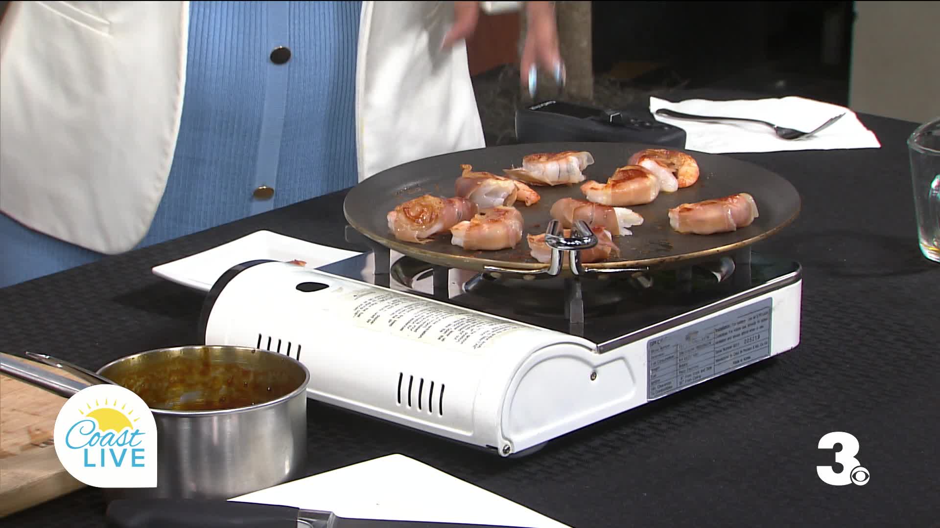 He walked us through the prep of prosciutto-wrapped shrimp with a tangy Teriyaki Honey sauce.
