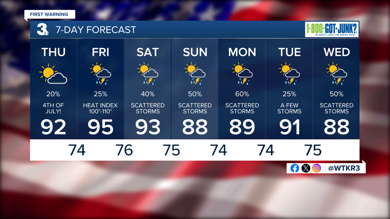 A few clouds but mainly sunshine throughout the day Thursday. The afternoon will be warm with highs in the low 90s. The humidity will be higher which will cause it to feel like the upper 90s, near 100 degrees. There will be the chance for an isolated shower or thunderstorm during the evening.