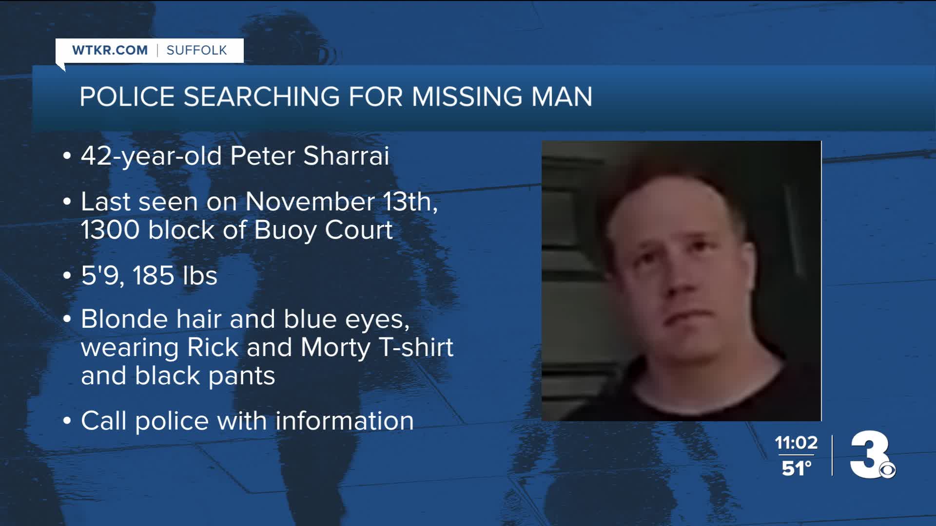 Physical description: approximately five-feet, nine-inches tall and 185 pounds. He has blonde hair and blue eyes. Sharrai was last seen wearing a black Rick and Morty T-shirt and black pants.