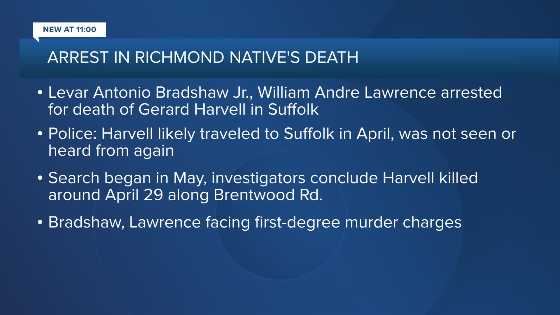 According to Suffolk Police, 41-year-old Levar Antonio Bradshaw Jr. and 47-year-old William Andre Lawrence have been arrested and charged for the murder of 48-year-old Gerard Harvell. Both are charged with first degree murder and other charges, and are currently in custody.
