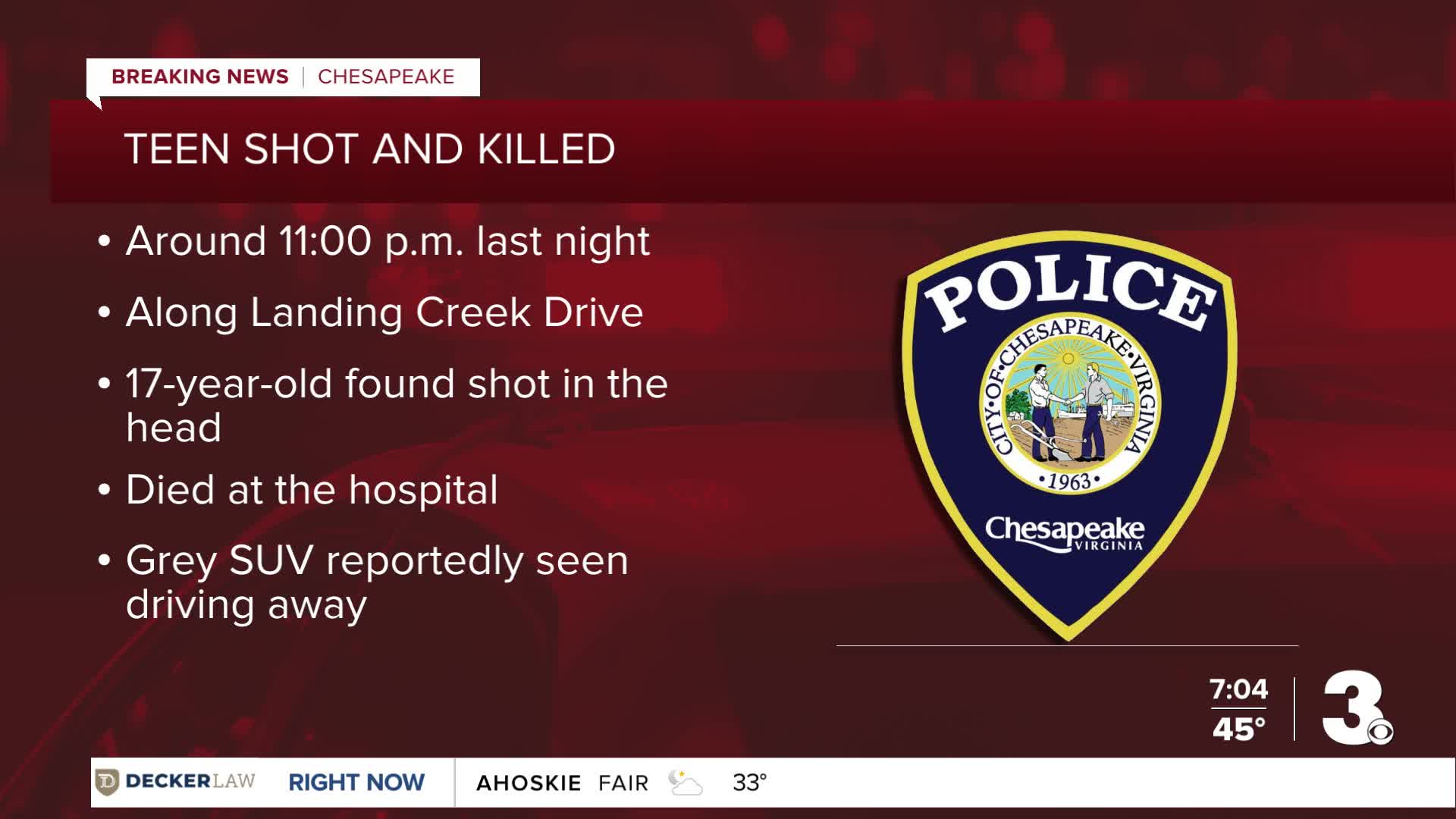 Chesapeake police responded to the 900 block of Landing Creek Drive at around 11:05 p.m. When they arrived, they found a 17-year-old who had been shot in the head.