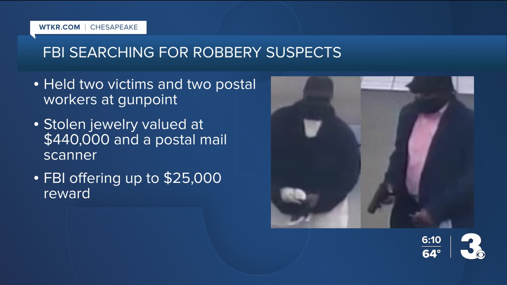 According to the FBI's tip portal, the NY Jewelry store is the business that was robbed. This happened on Oct. 9, with the suspects entering the store at 3:25 p.m. and leaving around 3:31 p.m., Chesapeake officials say.