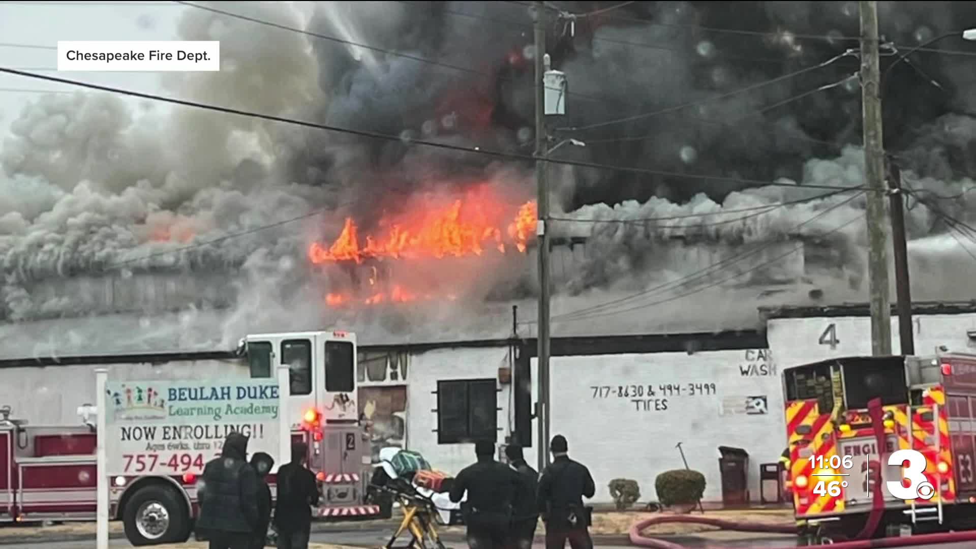 The Chesapeake Fire Department said crews were called around 1:05 p.m. to a commercial building in the 200 block of Liberty Street, also associated with an address on 16th Street. Firefighters arriving minutes later reported heavy smoke and flames coming from the roof of the one-story building, which houses A1 Auto.