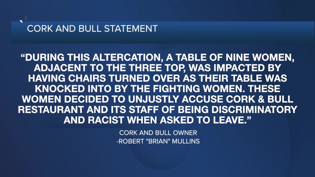 In an "open letter to all past and future clients" of the restaurant, Cork & Bull owner Robert "Brian" Mullins wrote that he supports his staff after spending months reviewing restaurant footage of the incident.