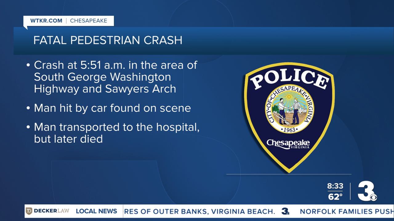 CHESAPEAKE, Va. — A pedestrian was killed after being hit by a car early Monday morning, said Chesapeake police.