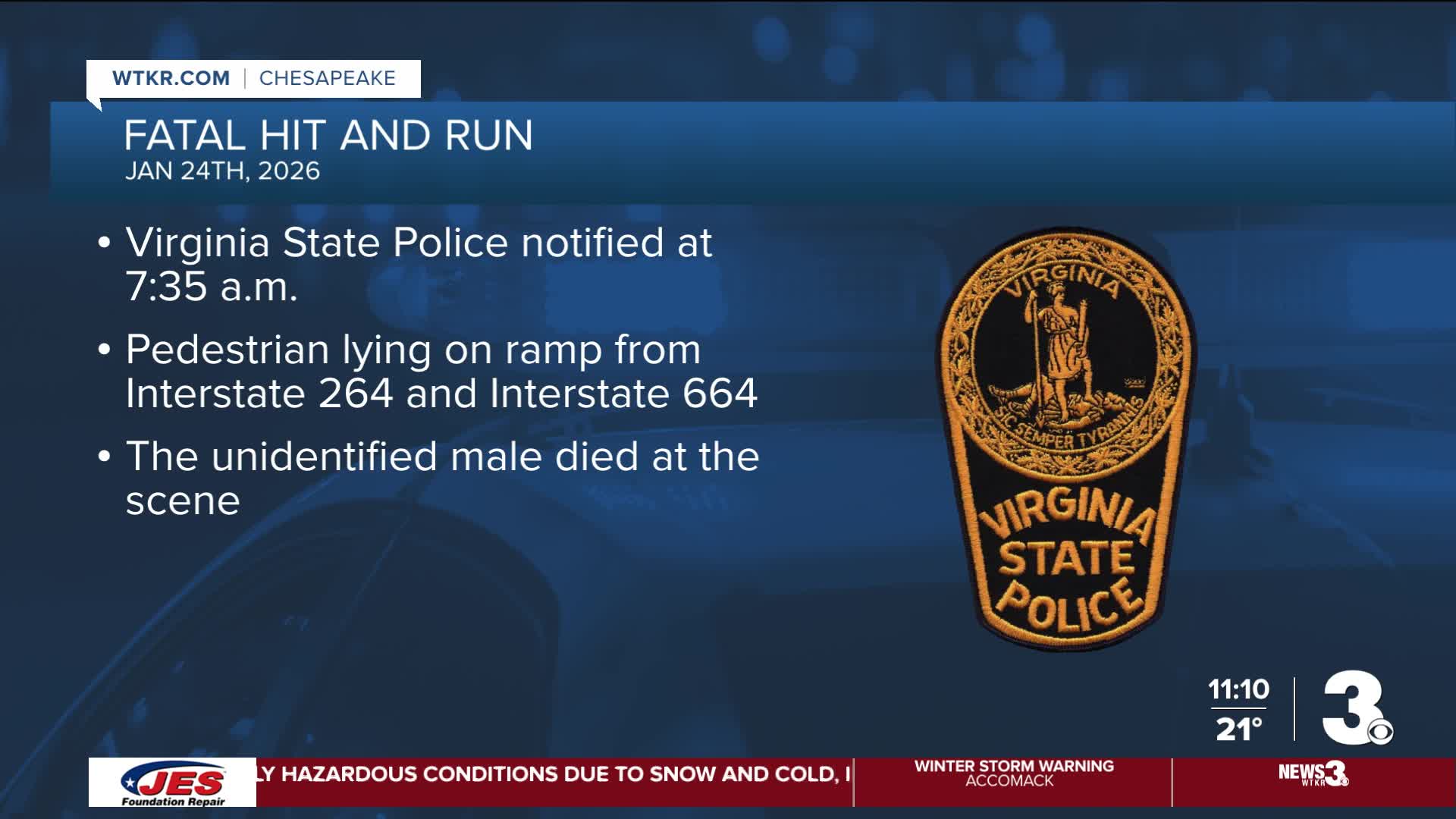 CHESAPEAKE, Va. — Virginia State Police are investigating a fatal hit-and-run that killed a pedestrian Saturday morning on Interstate 264 in Chesapeake.