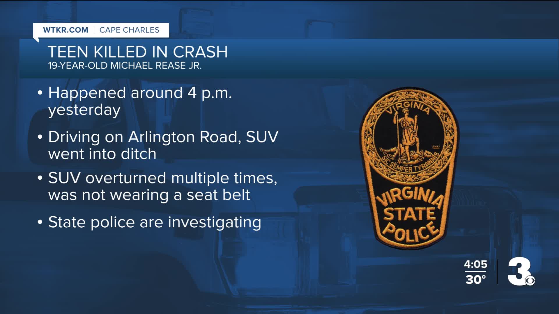 19-year-old Michael Justin-Travis Rease, Jr. was driving on Arlington Road between Sherwood Gate and Sapphire Court when his 2018 Buick Enclave went off the right side of the road into a ditch, overturning multiple times, according to Virginia State Police. Rease died at the scene; he was not wearing a seatbelt. This incident took place around 4:39 p.m. on Sunday.