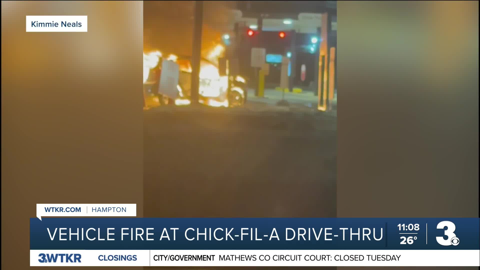 HAMPTON, Va. — A car caught fire at a Chick-fil-A drive thru on Monday, according to the Hampton Division of Fire and Rescue.