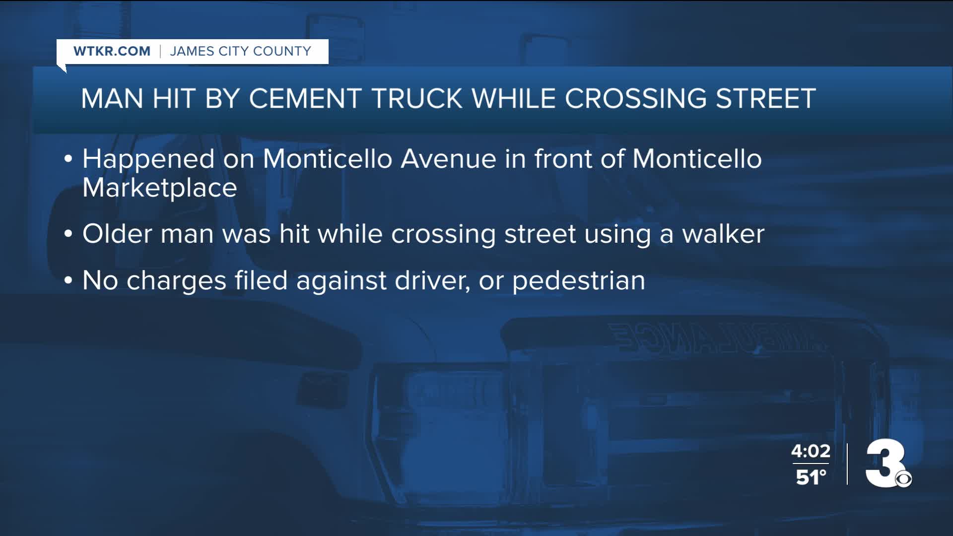 Officials say an elderly man from James City County was crossing the street using a walker when he was hit by a cement truck. Officers found him unresponsive, and he was taken to the hospital with serious injuries.