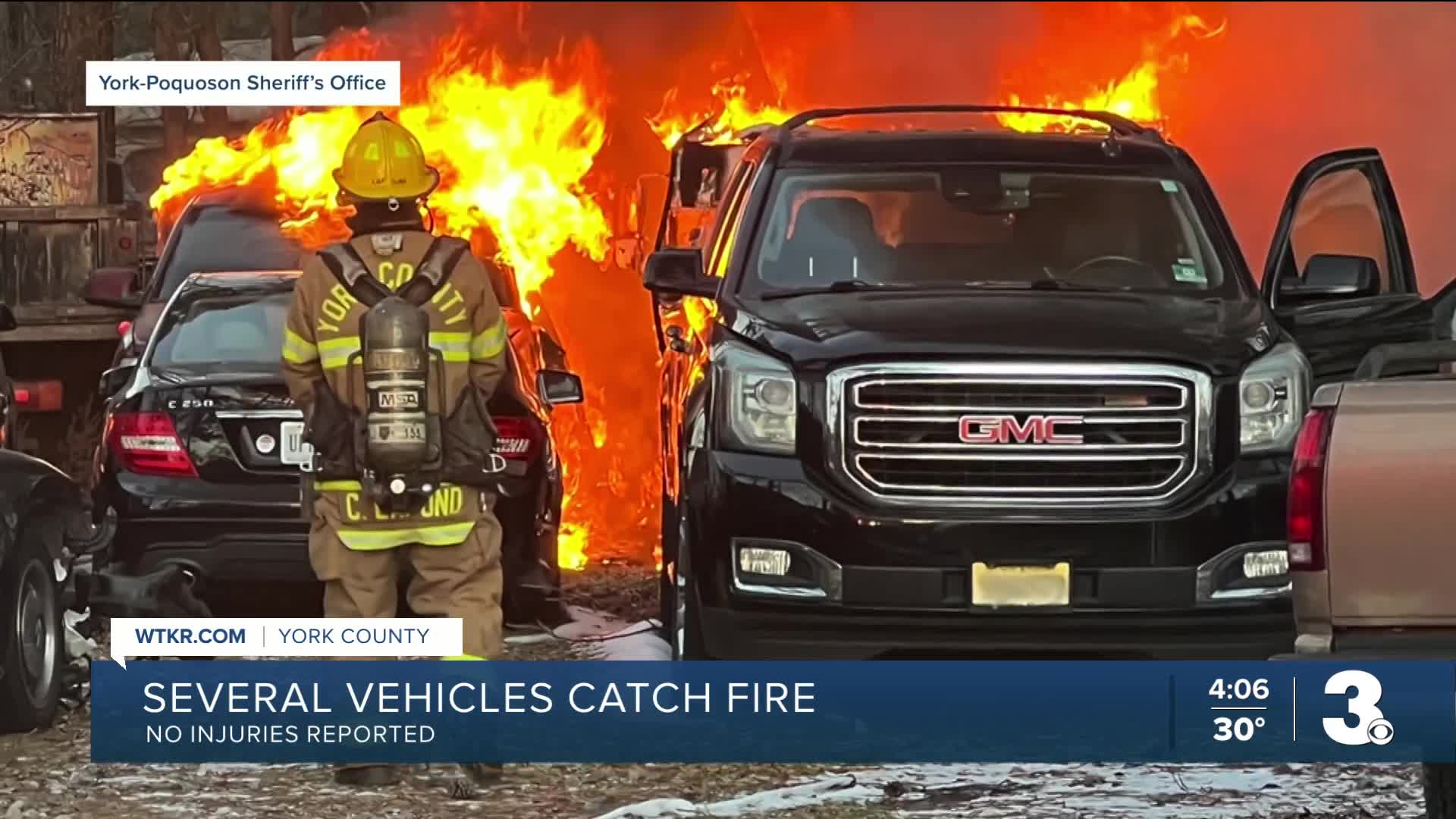 YORK COUNTY, Va. — Several vehicles caught fire Sunday evening behind a diesel repair business in York County’s Grafton area, but no one was hurt and nearby buildings were not damaged.