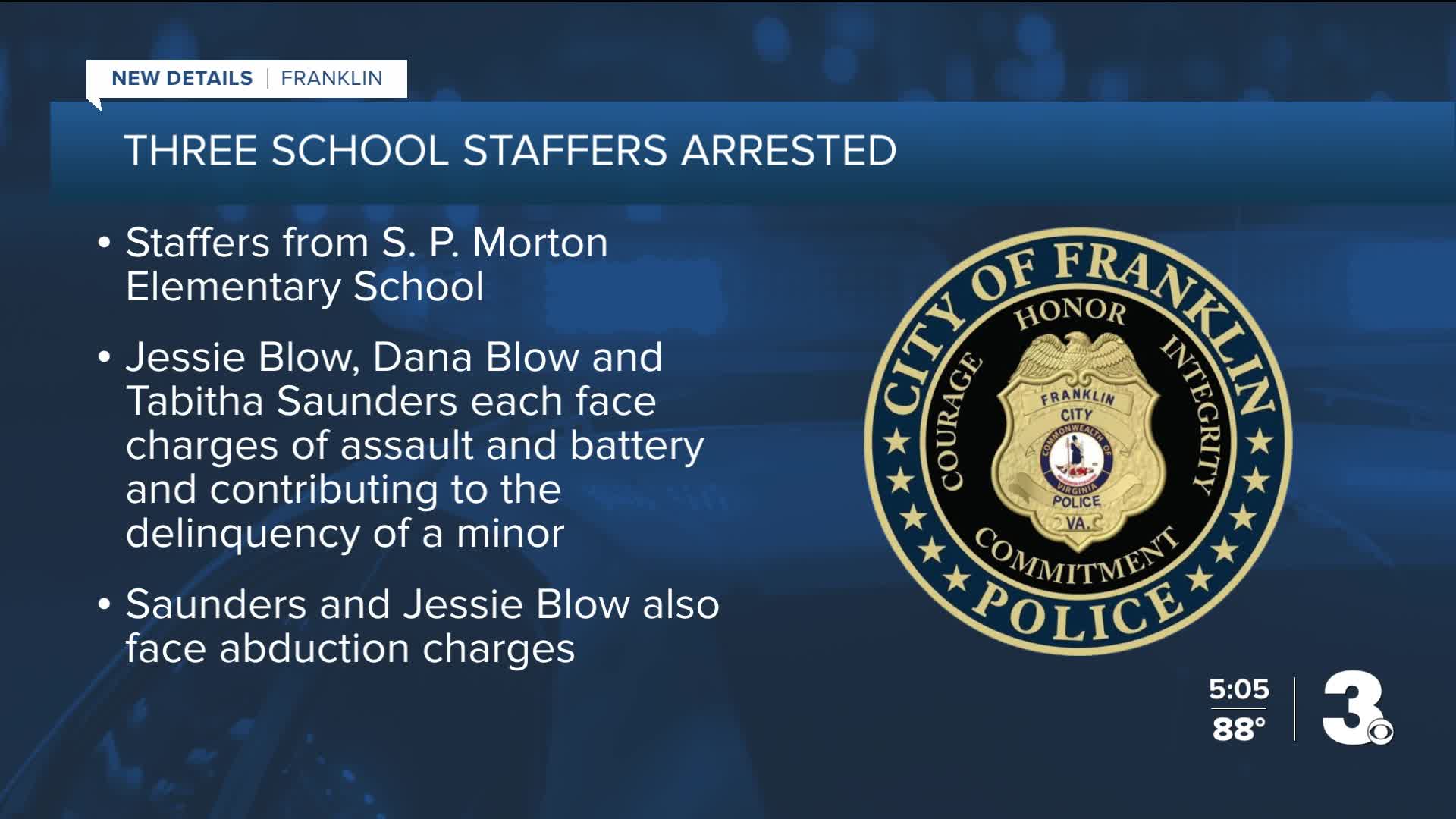 FRANKLIN, Va. — Three staff members at S.P. Morton Elementary School were arrested and charged on March 18 with contributing to the delinquency of a minor in a special education classroom, according to the City of Franklin Police Department.