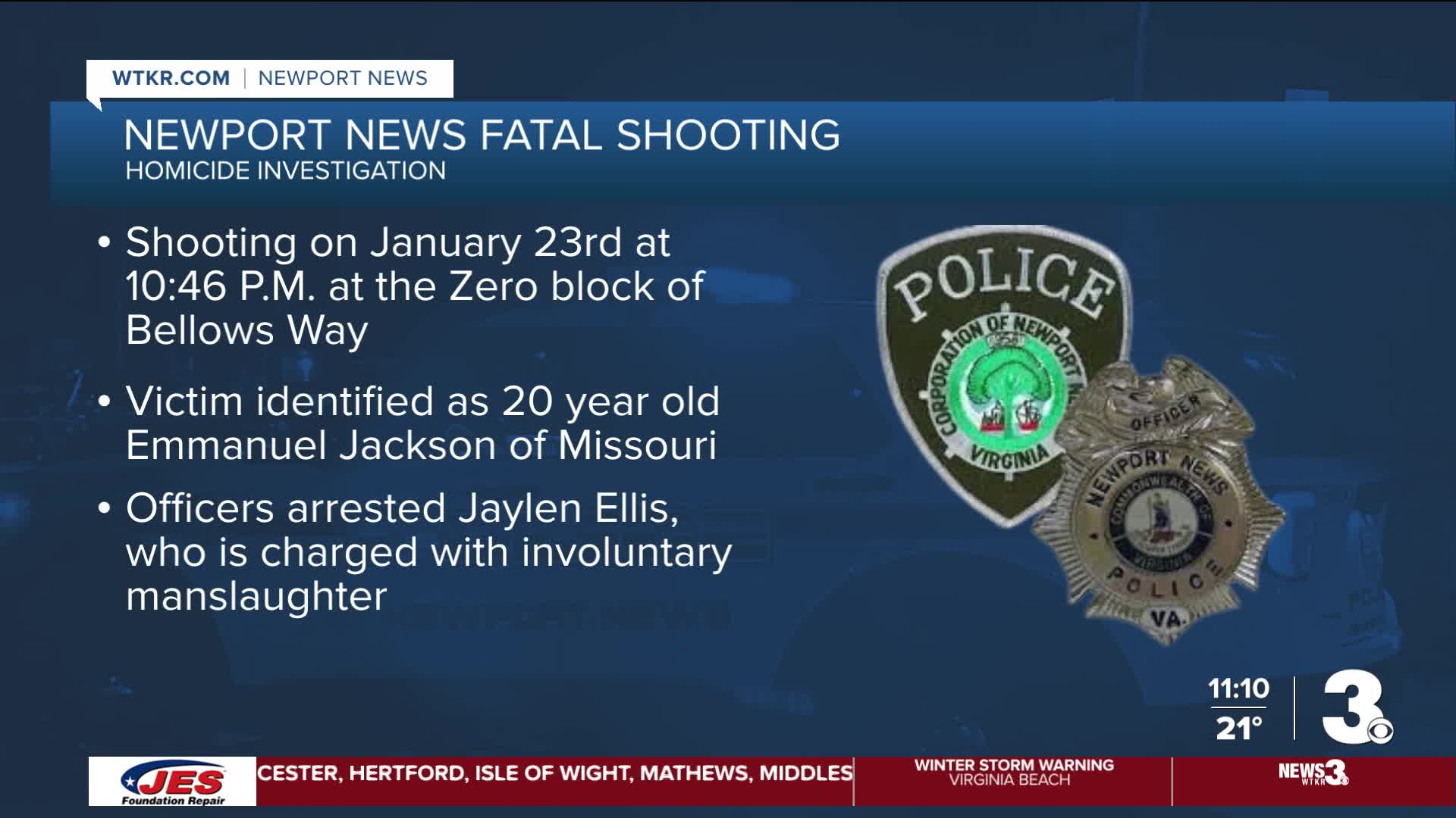 Following an investigation, police arrested Jaylen Ellis, an adult Newport News man. He is charged with involuntary manslaughter and discharging a firearm in a building or dwelling.