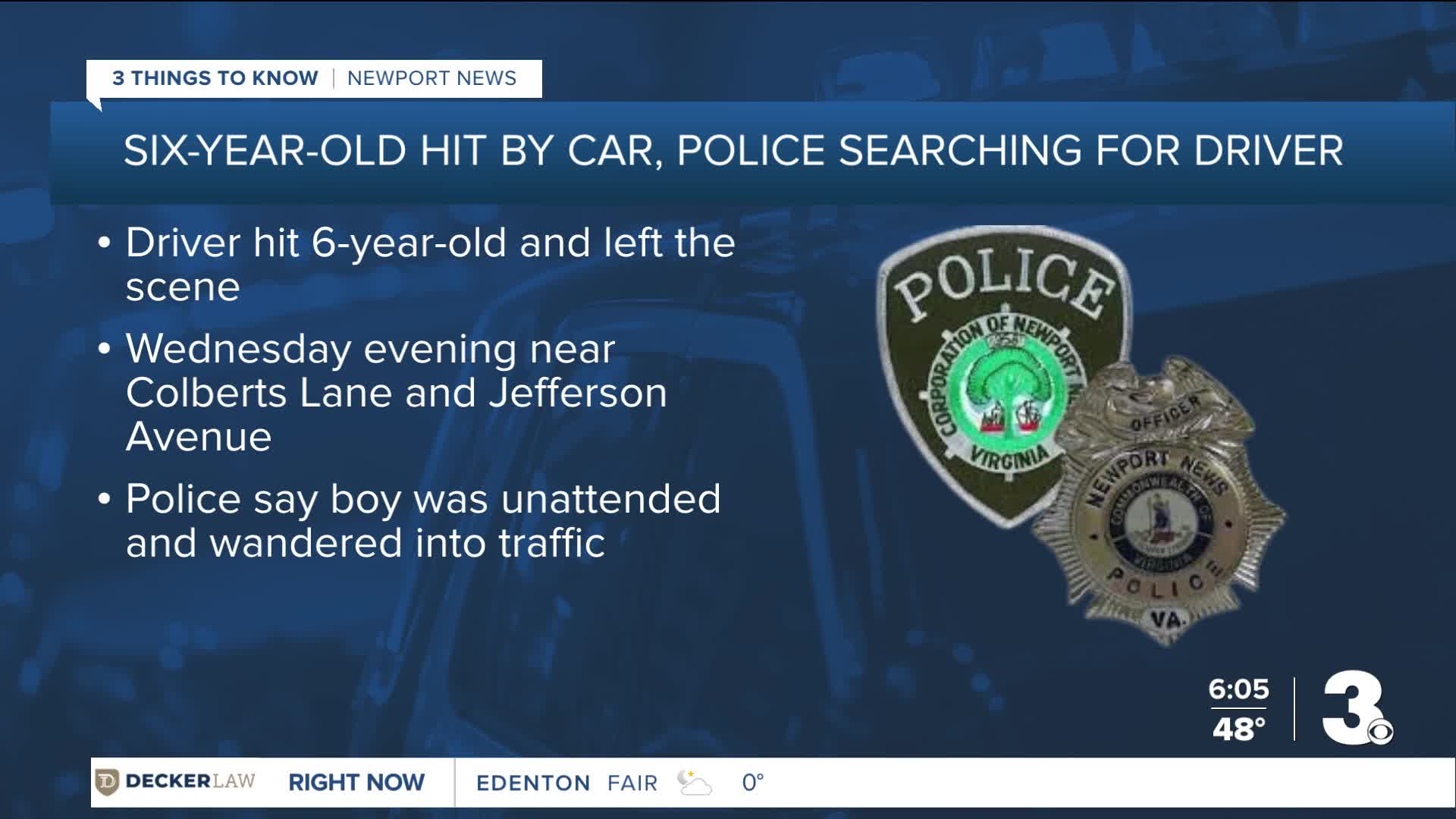 NEWPORT NEWS, Va. — Newport News police are searching for a driver after a 6-year-old boy was hit by a car during a hit and run on Wednesday, according to NNPD.