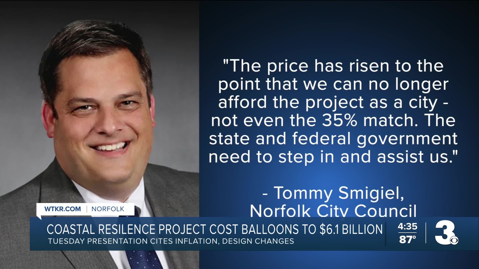 NORFOLK, Va. — During a presentation at a Tuesday Work Session, Norfolk's city council learned the estimated cost of a massive flood resilience project ballooned from $2.6 billion to $6.1 billion.