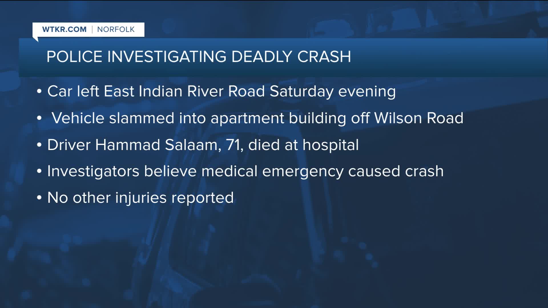 NORFOLK, Va. — Norfolk police are investigating a single-car crash that left a 71-year-old man dead Saturday evening.