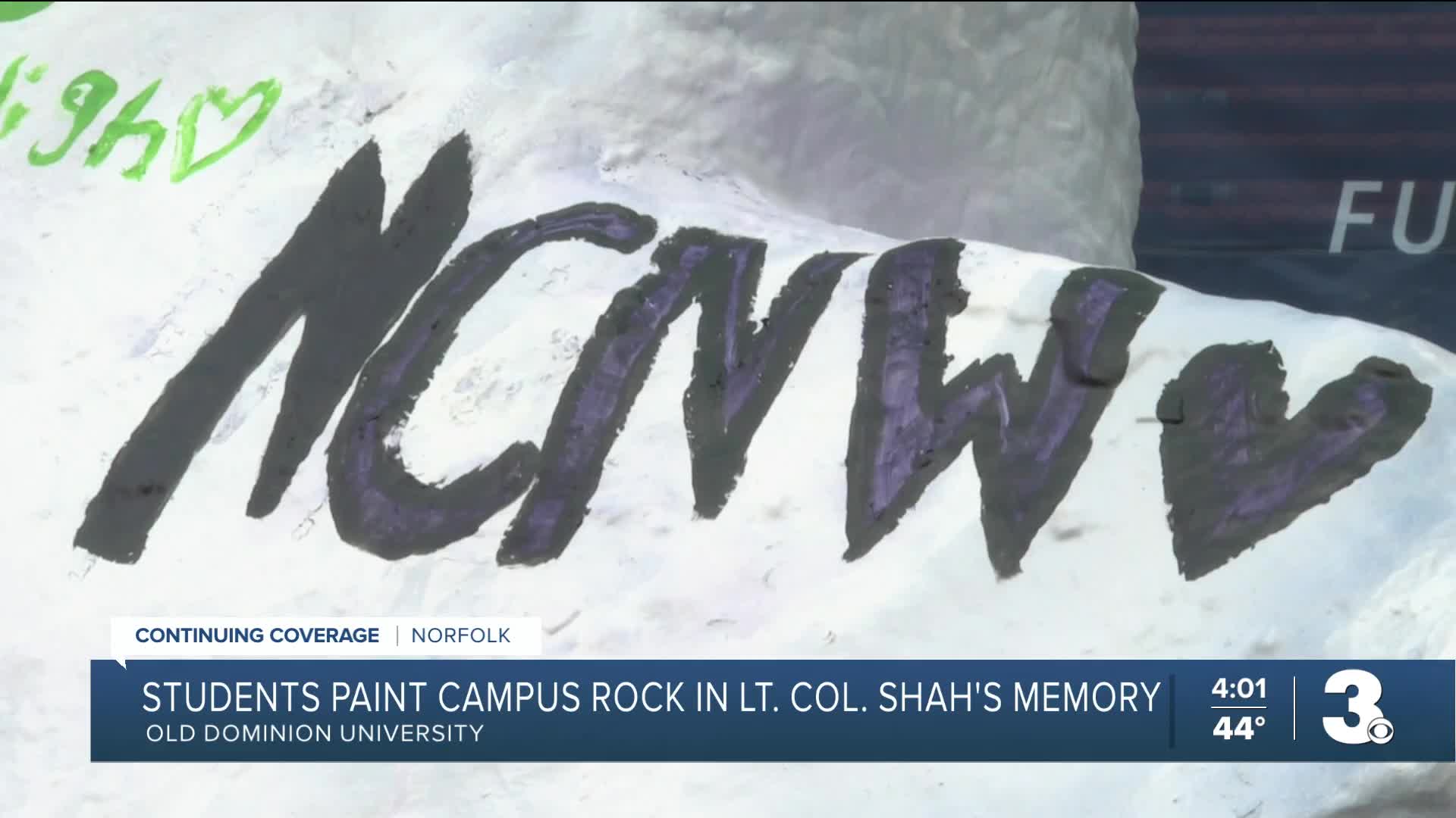 When students returned on Monday, the ODU chapter of the National Council of Negro Women (NCNW) began painting a boulder near the Engineering Systems Building with Lt. Col. Shah's name and one of the phrases he was known to tell his ROTC classes; "Be bold. Be quick. Be gone."