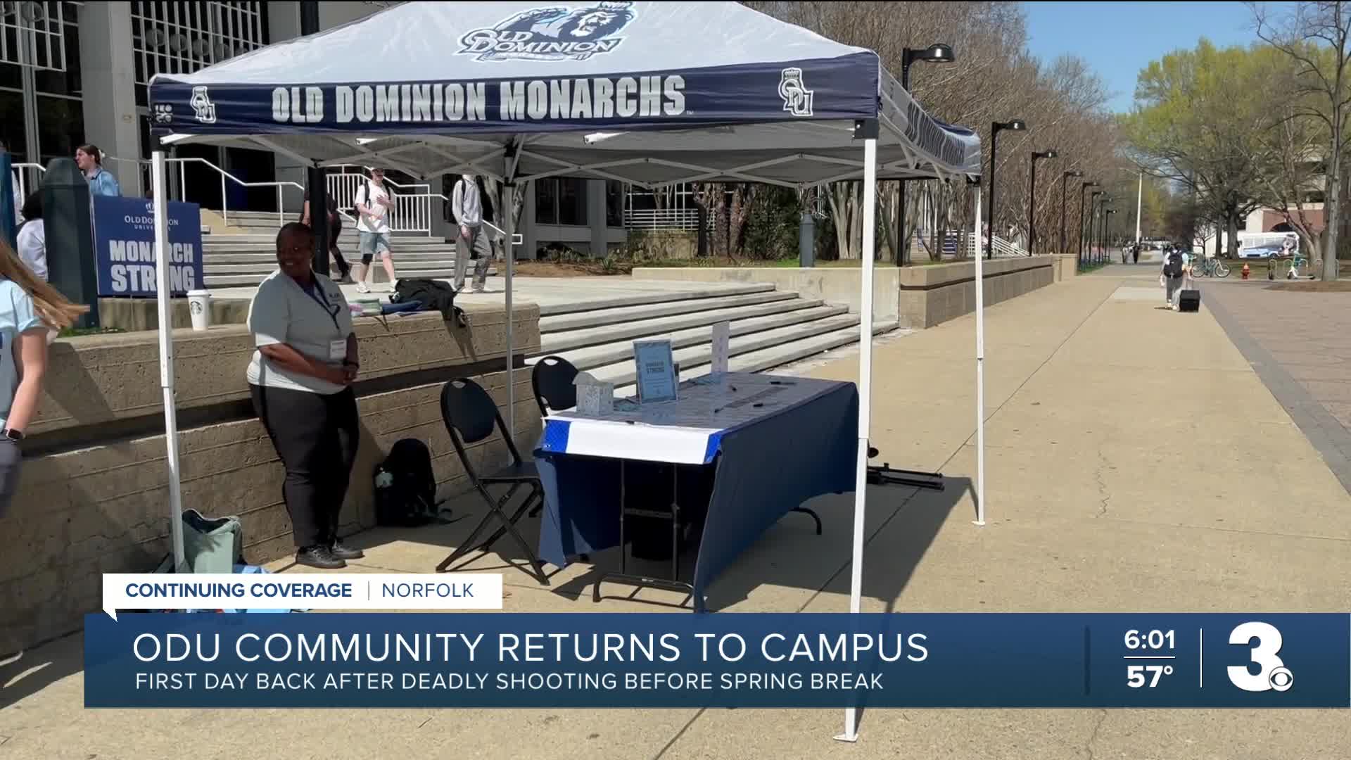 NORFOLK, Va. — Old Dominion University students returned to campus from spring break on Monday, attending classes for the first time since the deadly shooting unfolded on campus.