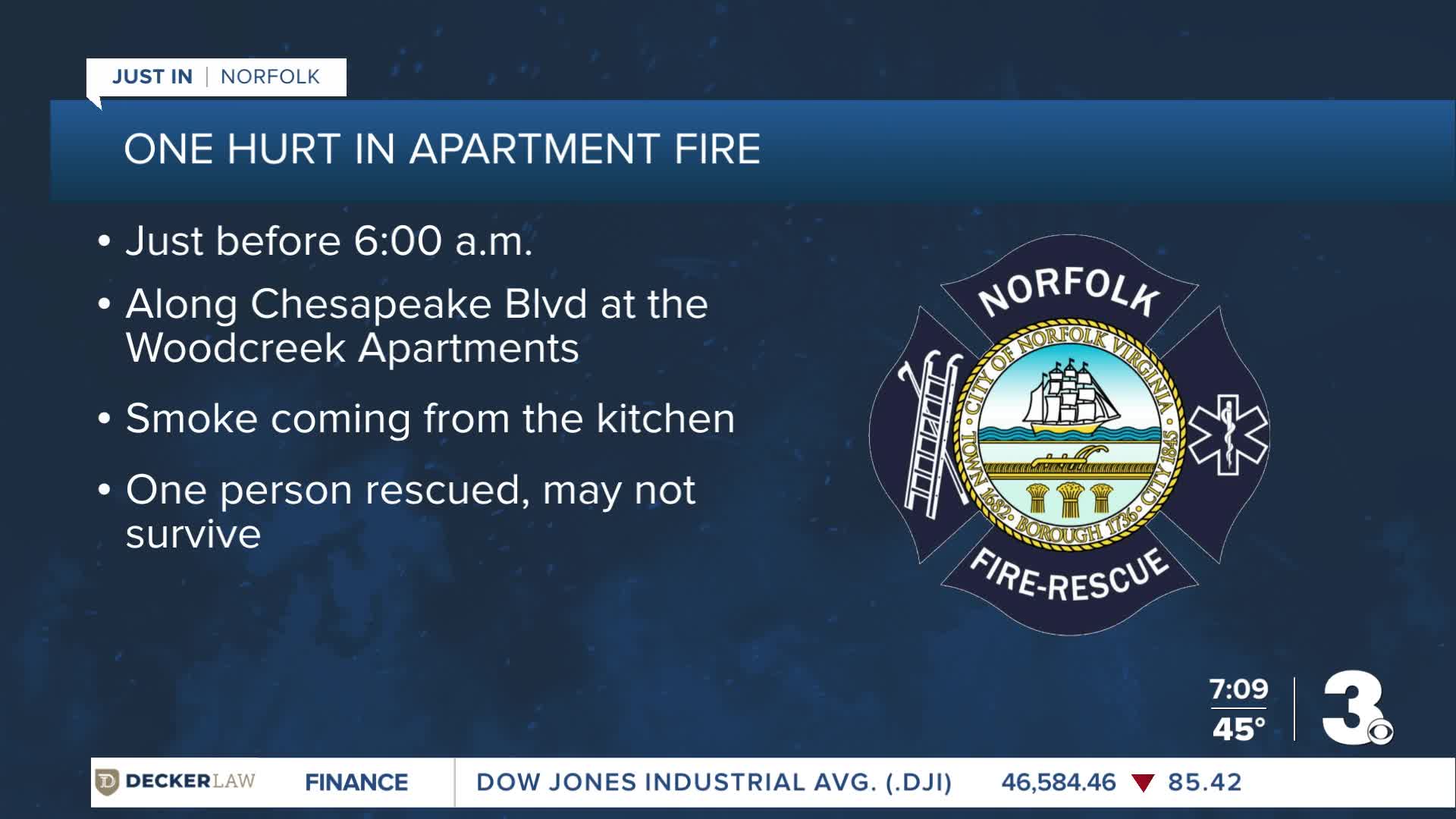 Norfolk Fire-Rescue responded to 9600 Chesapeake Blvd at around 6:00 a.m. Units found heavy smoke inside the apartment and extinguished a fire in the kitchen. An adult was rescued from the apartment and taken to the hospital in critical condition. No other apartments were affected and there were no other injuries according to Norfolk Fire-Rescue.