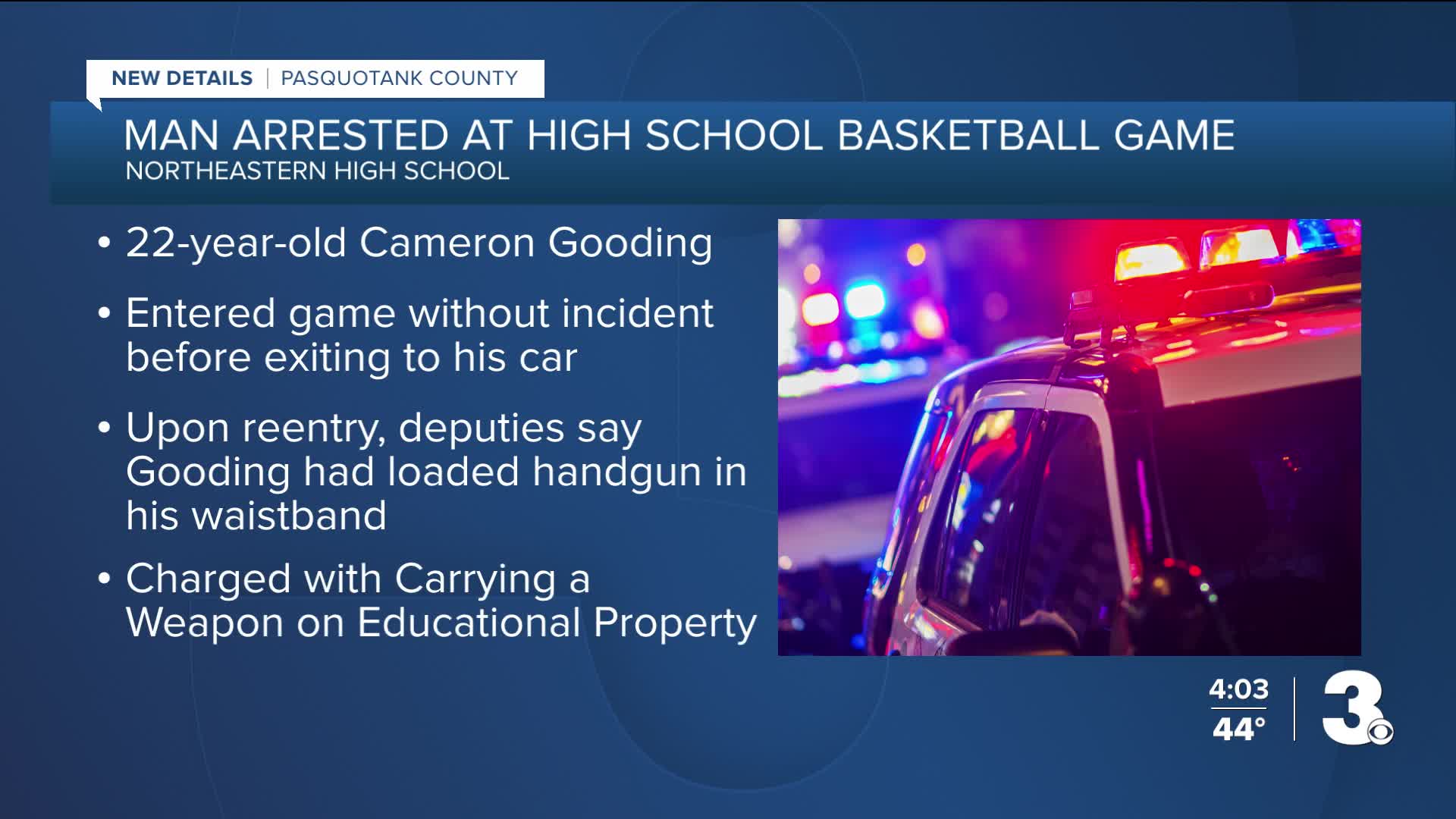 Cameron Gooding, of Deep Run, N.C., initially entered the game between Northeastern High School and South Lenoir High School without issue, according to the Pasquotank County Sheriff’s Office. He later left the building to get a coat from his vehicle — Gooding then passed through security screening again upon his return. This resulted in Pasquotank deputies finding a loaded 9mm handgun concealed in Gooding's waistband, leading to his arrest.