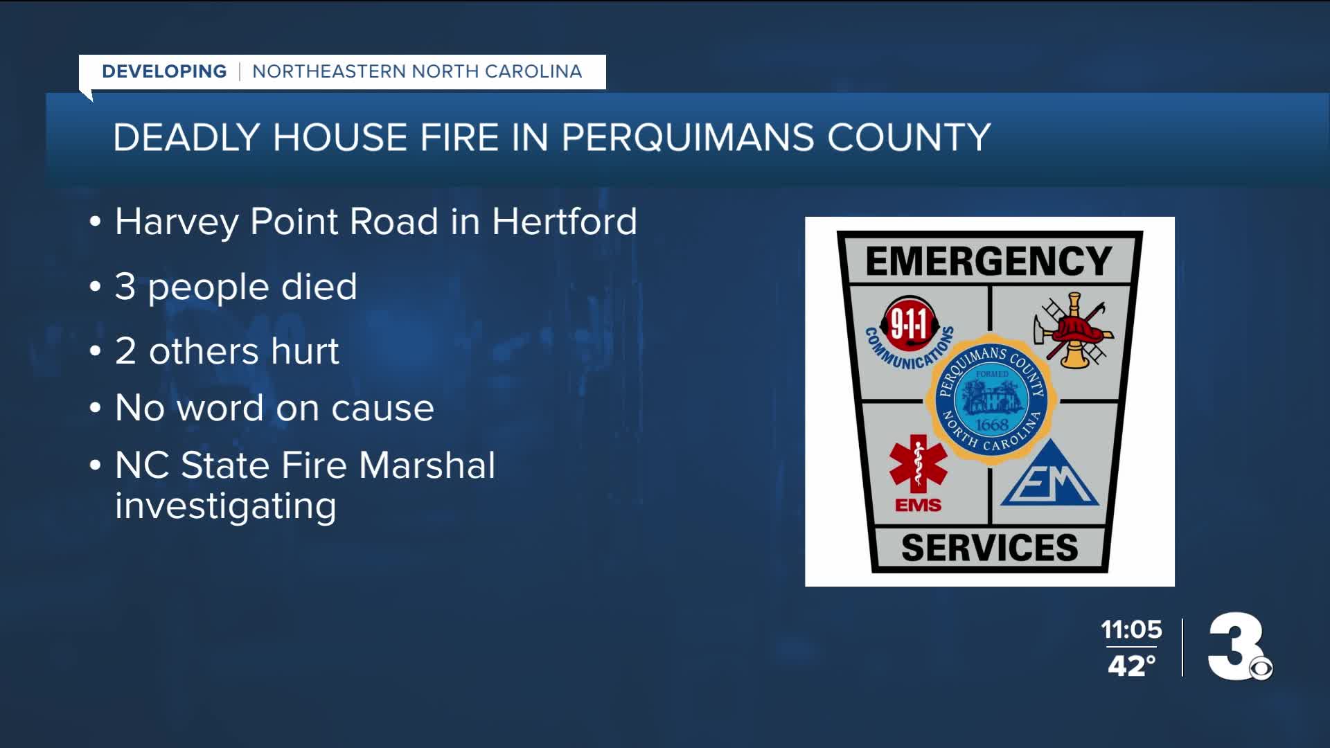 The fire was brought under control, and deputies with the Perquimans County Sheriff’s Office remained on scene as of Saturday. Officials said the incident resulted in two survivors and three deaths.
