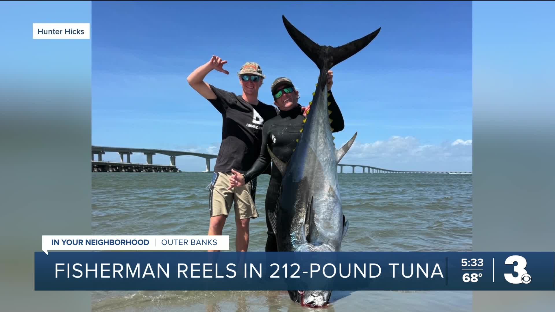 That's right — Hicks says he had a 500-pound bluefin tuna on his hook initially, which ended up spitting the hook out. Then the next time he cast, the 212-pound, 70-inch bluefin tuna hooked right on.
