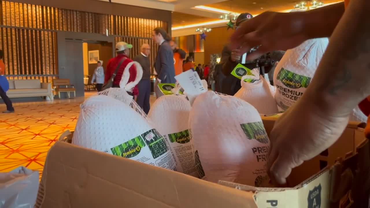 The distribution included extra holiday meal components beyond the turkeys, ensuring families received complete Thanksgiving dinners.