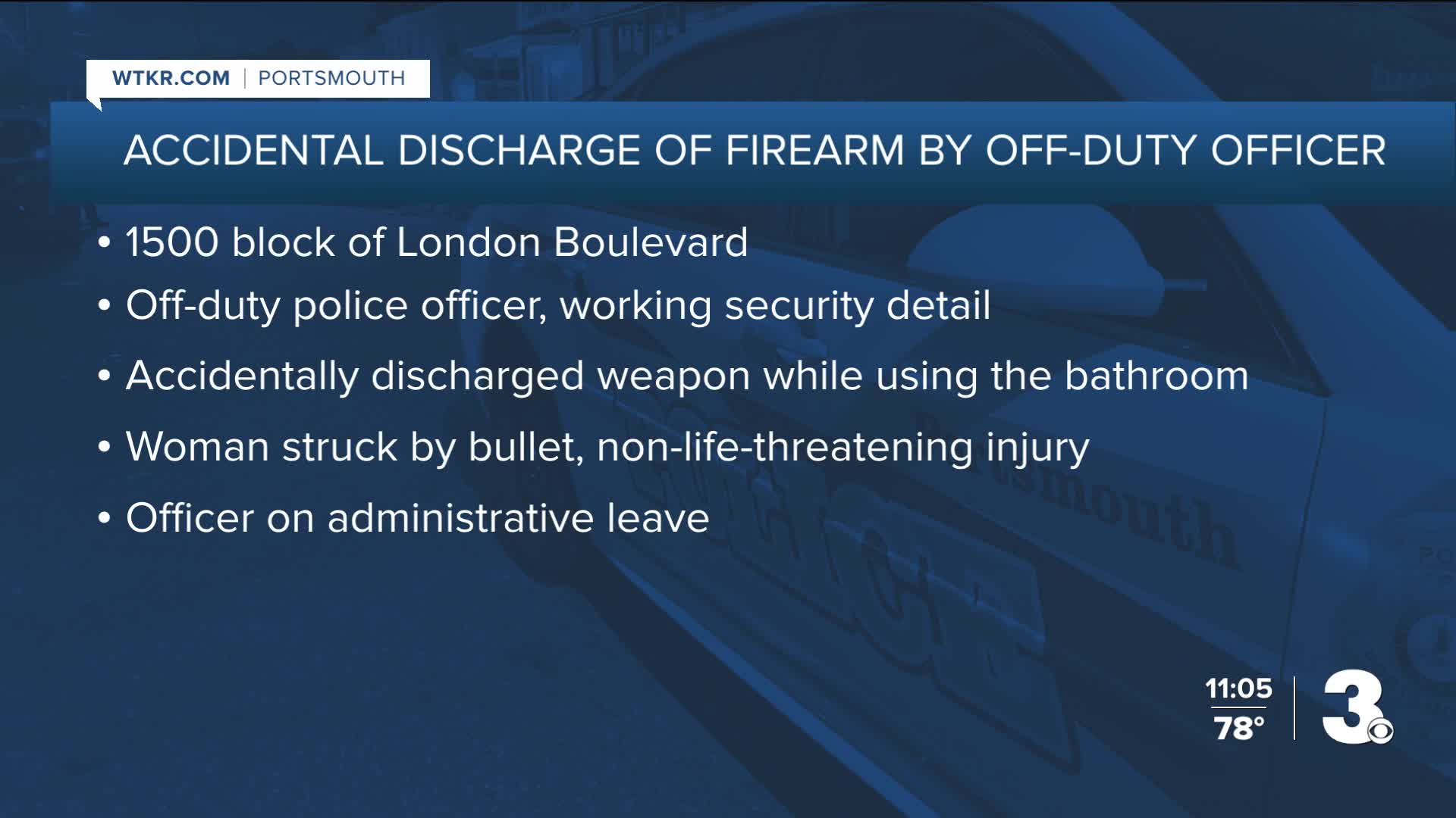PORTSMOUTH, Va. — An off-duty Portsmouth police officer's service weapon was accidentally fired, hitting someone, while she was using the bathroom Friday afternoon, according to the city's police department.