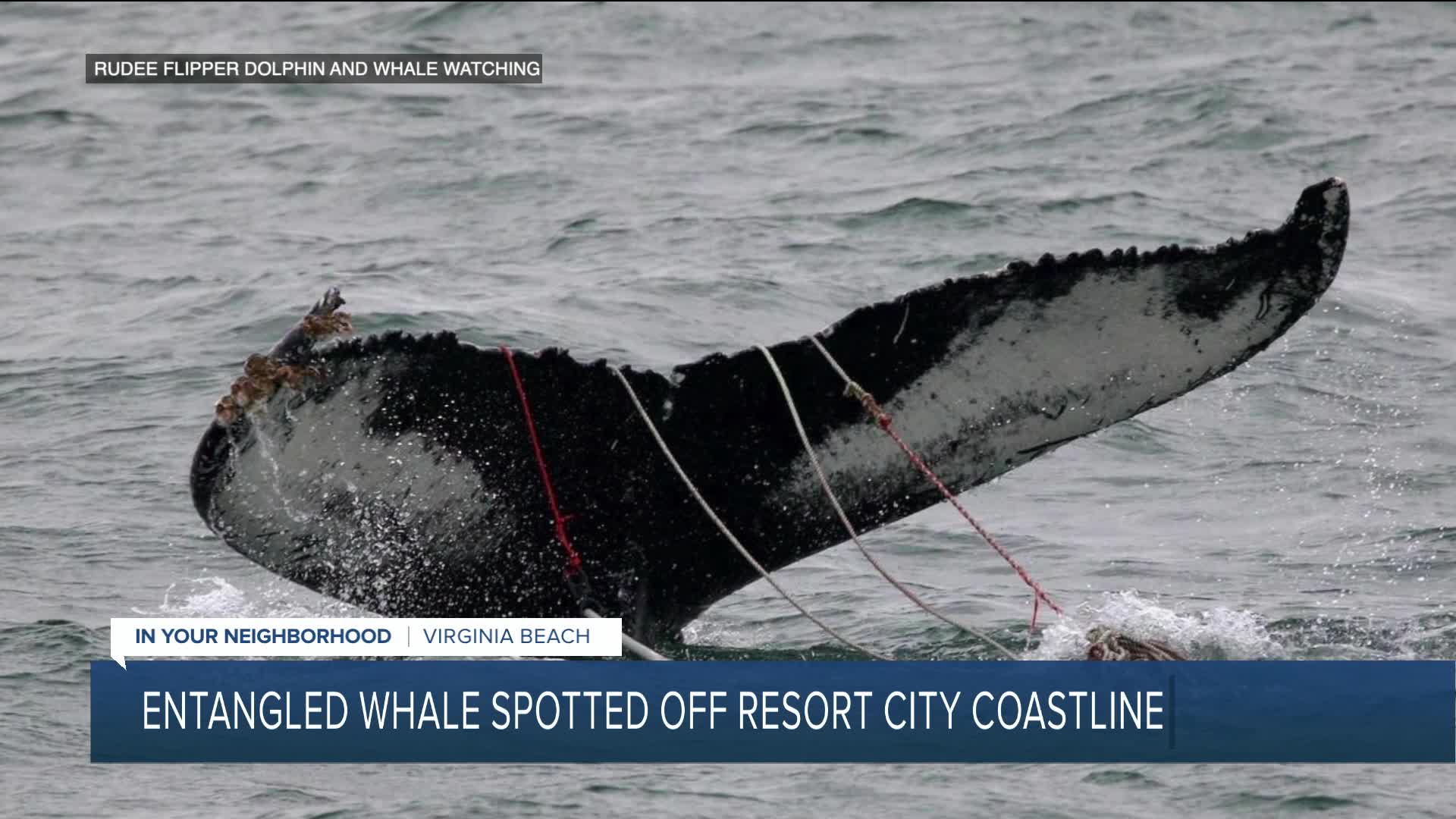 VIRGINIA BEACH, Va. — A whale was seen entangled off the coast of Virginia Beach, according to a social media post made by Rudee Flipper Dolphin and Whale Watching.