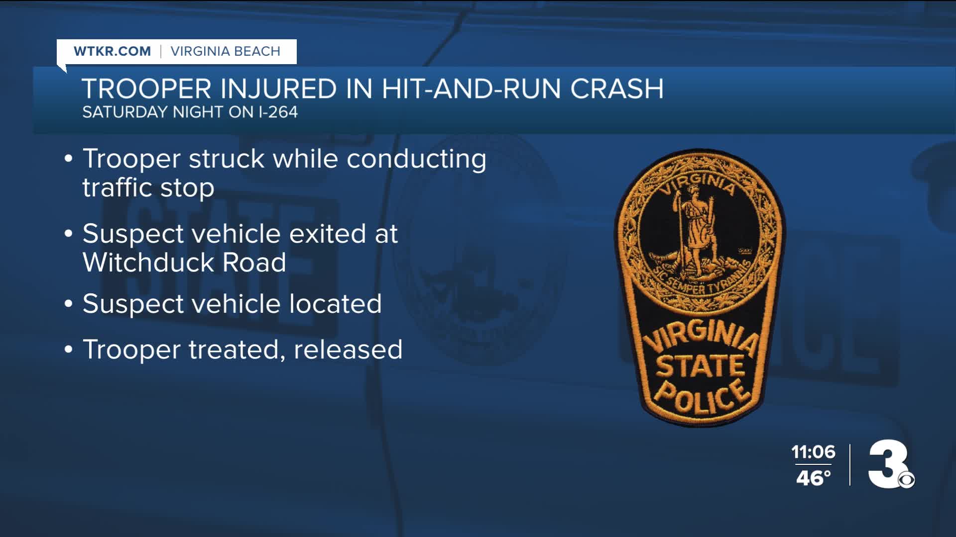 VIRGINIA BEACH, Va. — Virginia State Police are asking for the public’s help after a state trooper was injured in a hit-and-run crash Saturday night on Interstate 264 in Virginia Beach.