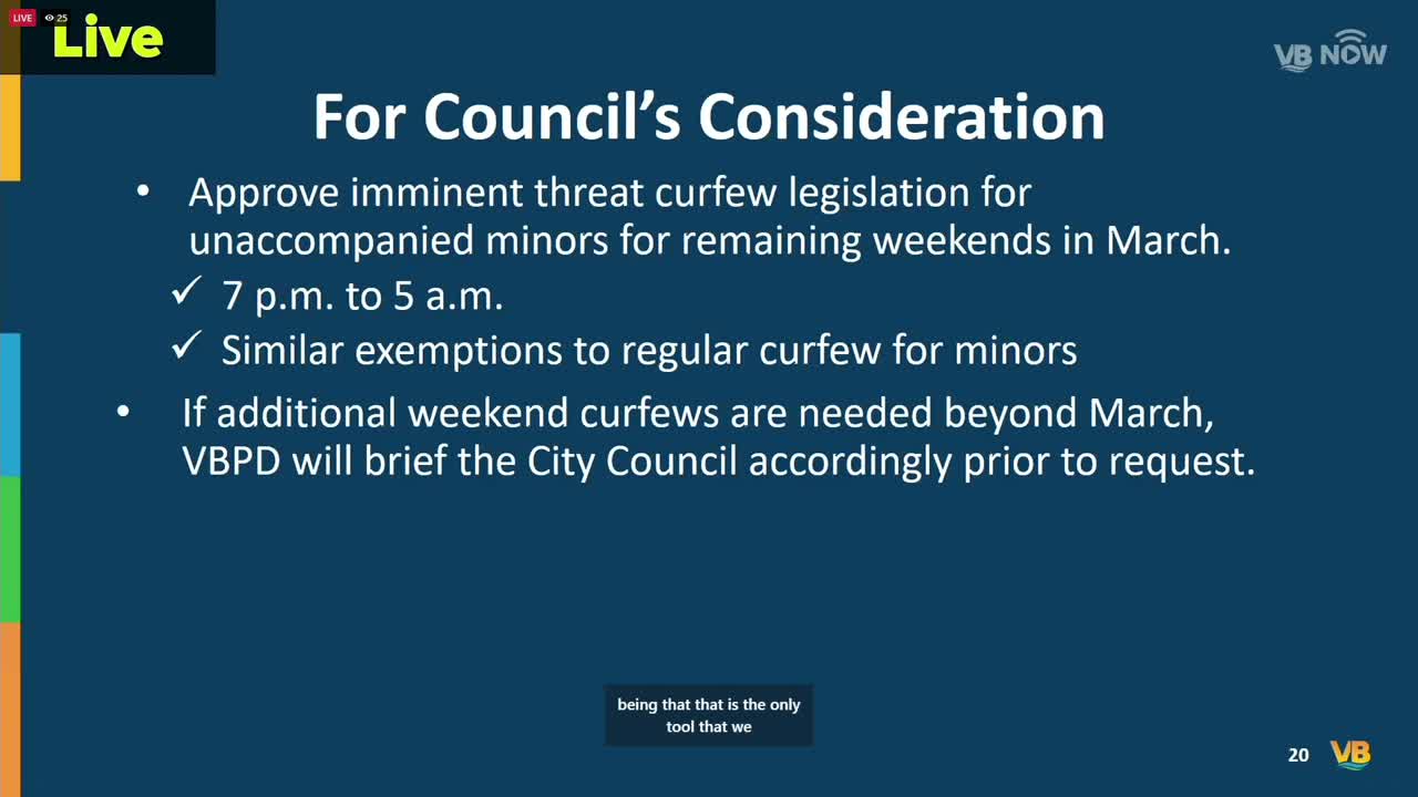 VIRGINIA BEACH, Va. — The Virginia Beach City Council will hold a special session at 4 p.m. on Thursday to vote on a proposed change to curfew rules following a recommendation from the police chief.