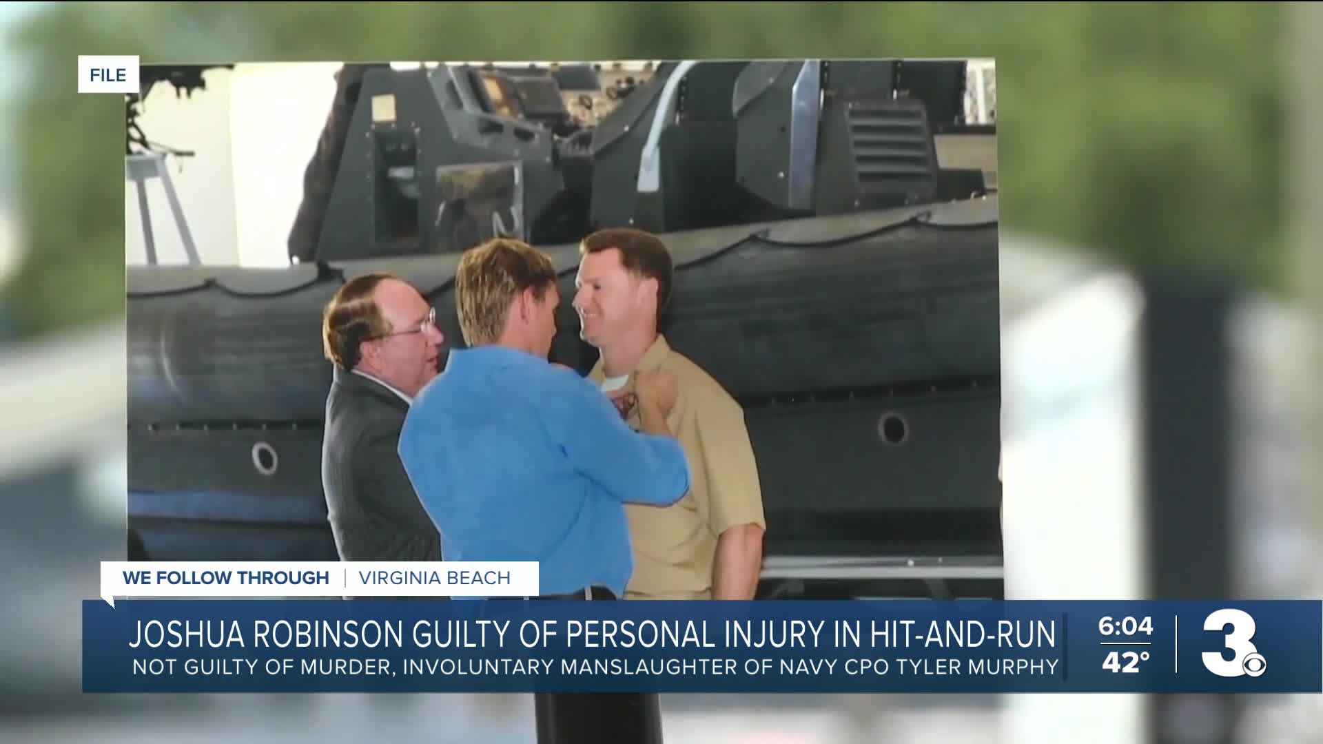 Joshua Robinson was found guilty of causing injury related to the hit-and-run that ended the life of Navy Chief Petty Officer Tyler Murphy; he was found not guilty of murder and involuntary manslaughter, the Virginia Beach Commonwealth's Attorney's office said.