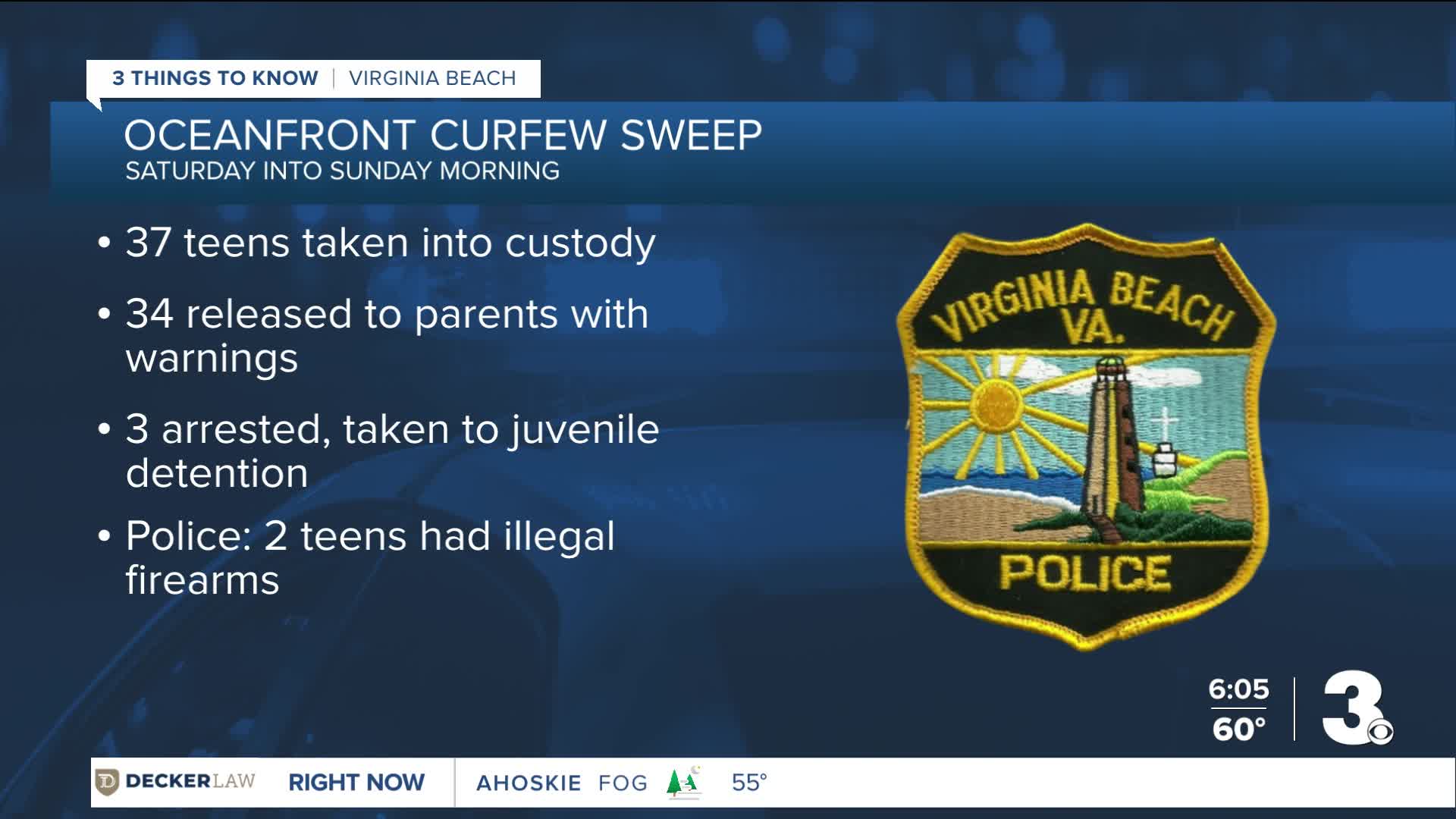 VIRGINIA BEACH, Va. — Virginia Beach police took 37 teens into custody during an unplanned curfew enforcement operation at the Oceanfront late Saturday night into early Sunday morning, according to the Virginia Beach Police Department.