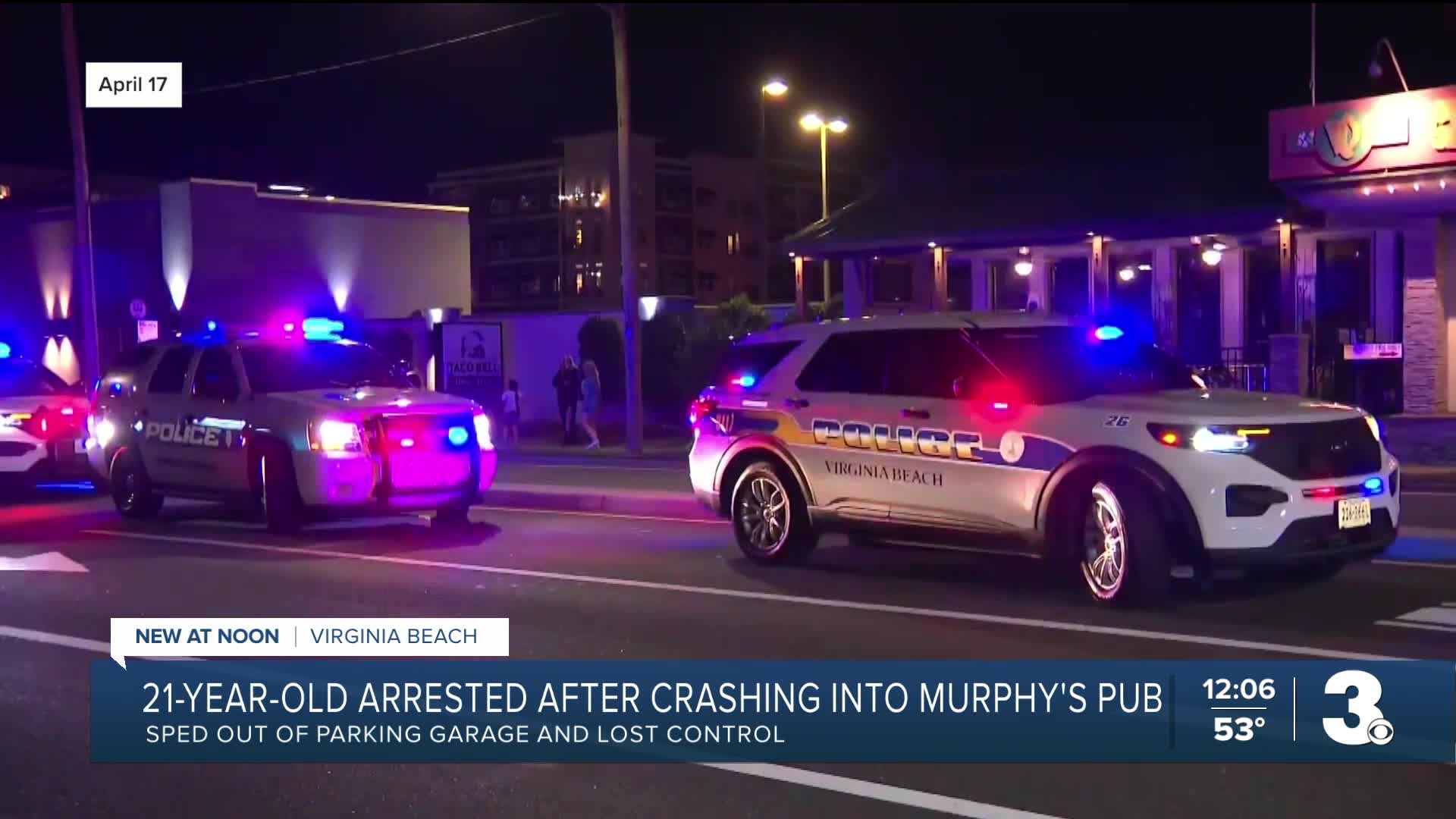 VIRGINIA BEACH, Va. — A 21-year-old woman has been charged after she crashed a car into the patio of Murphy’s Irish Pub at the Virginia Beach Oceanfront Friday night, court documents show.