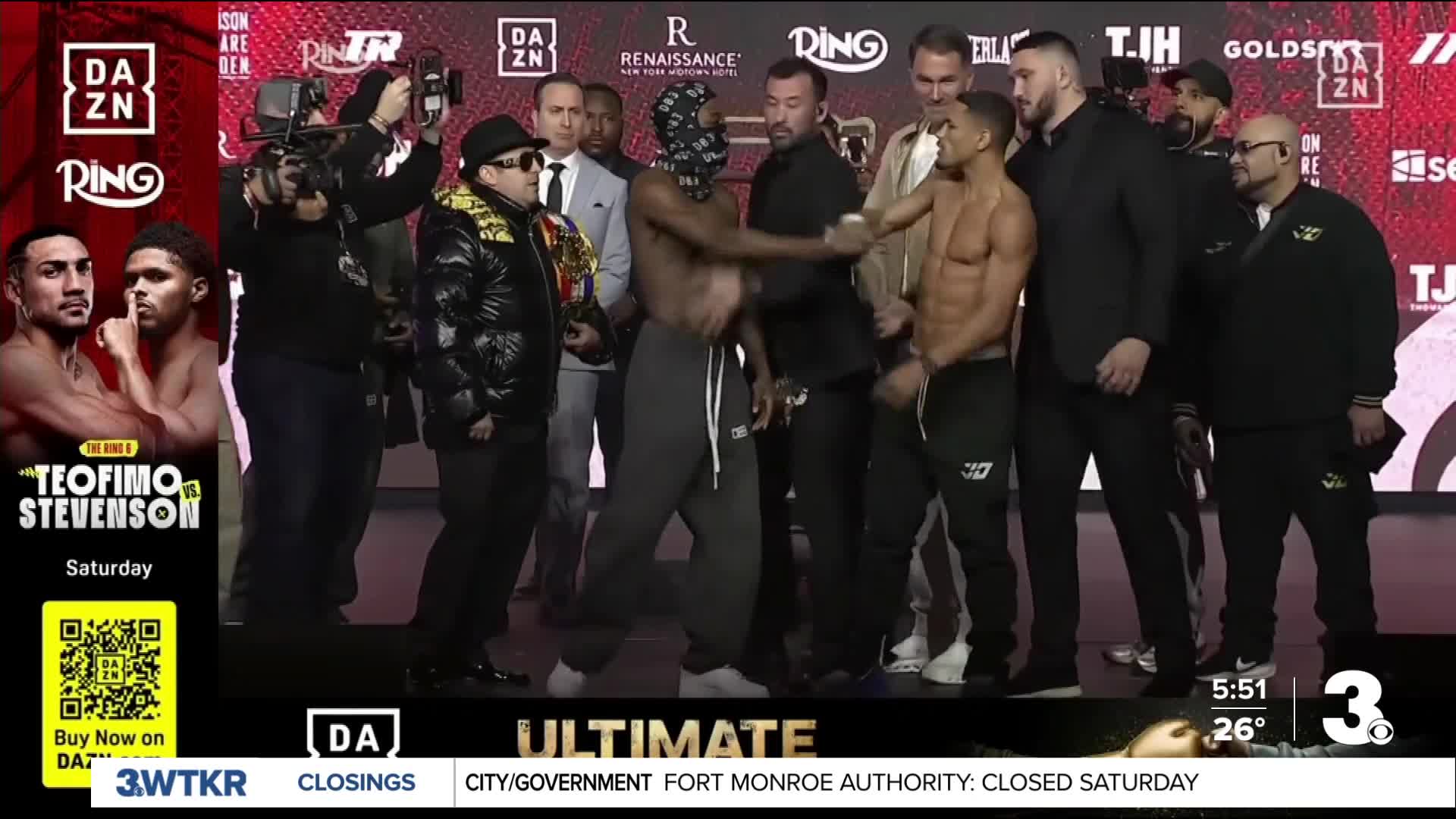 Davis and Ortiz square off in the co-feature, just before Saturday's main event between Teo'Fimo Lopez and Shakur Stevenson. Friday's stare-down between the two fighters got chippy at times, not uncommon in the pre-fight setting, with Ortiz calling it "personal," adding he was going to shut Davis up during the fight.