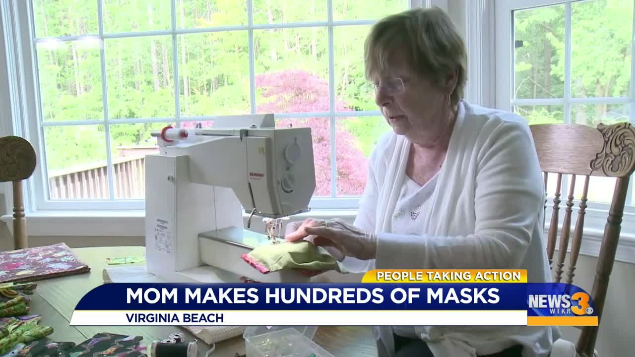 VIRGINIA BEACH, Va. - She is a mask-making mom, creating hundreds of facial coverings for local hospitals, churches, family and friends - and News 3 surprised her at home with a People Taking Award.