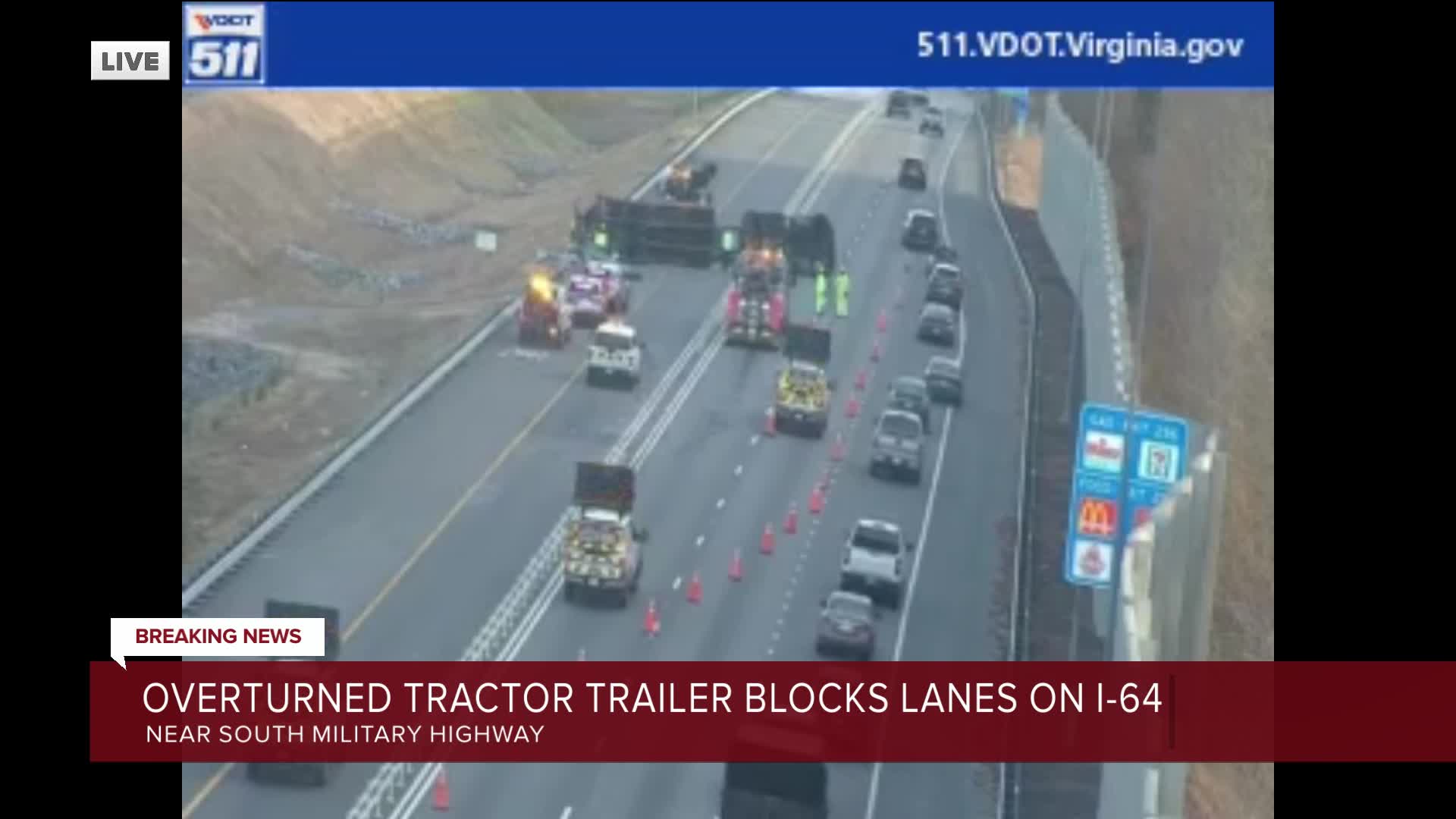 CHESAPEAKE, Va. — A tractor trailer was overturned in a single-vehicle crash on I-64 in Chesapeake Tuesday night.