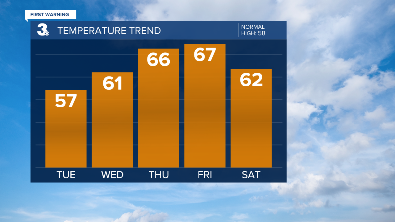 And even warmer weather rolls in for Thursday and Friday. Most of us will make it into the mid-to-upper 60s, but a few areas may even touch the 70 degree mark.