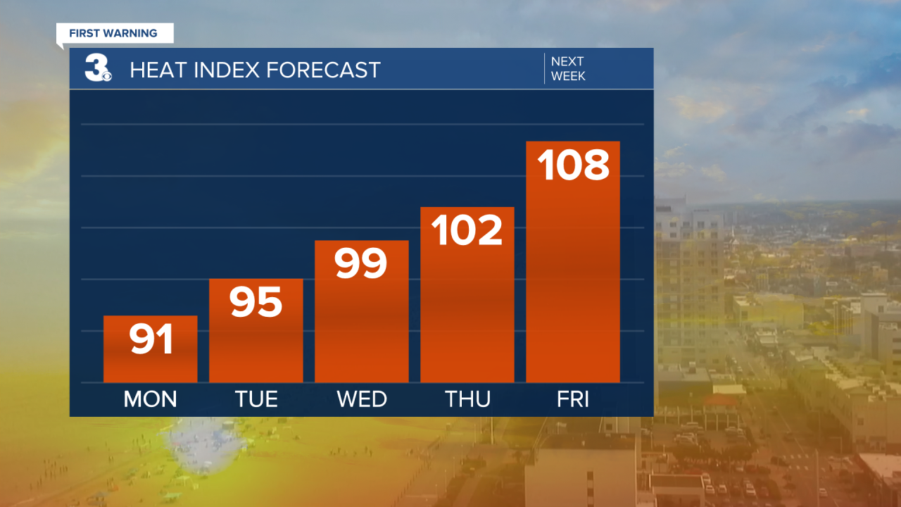 And that trend will stay with us through the work week. By Wednesday, our feels like temperatures will be approaching 100°. It looks like we will cross the century mark on Thursday and by Friday some of us could hit 110° with our heat index. Proof that it is still July!