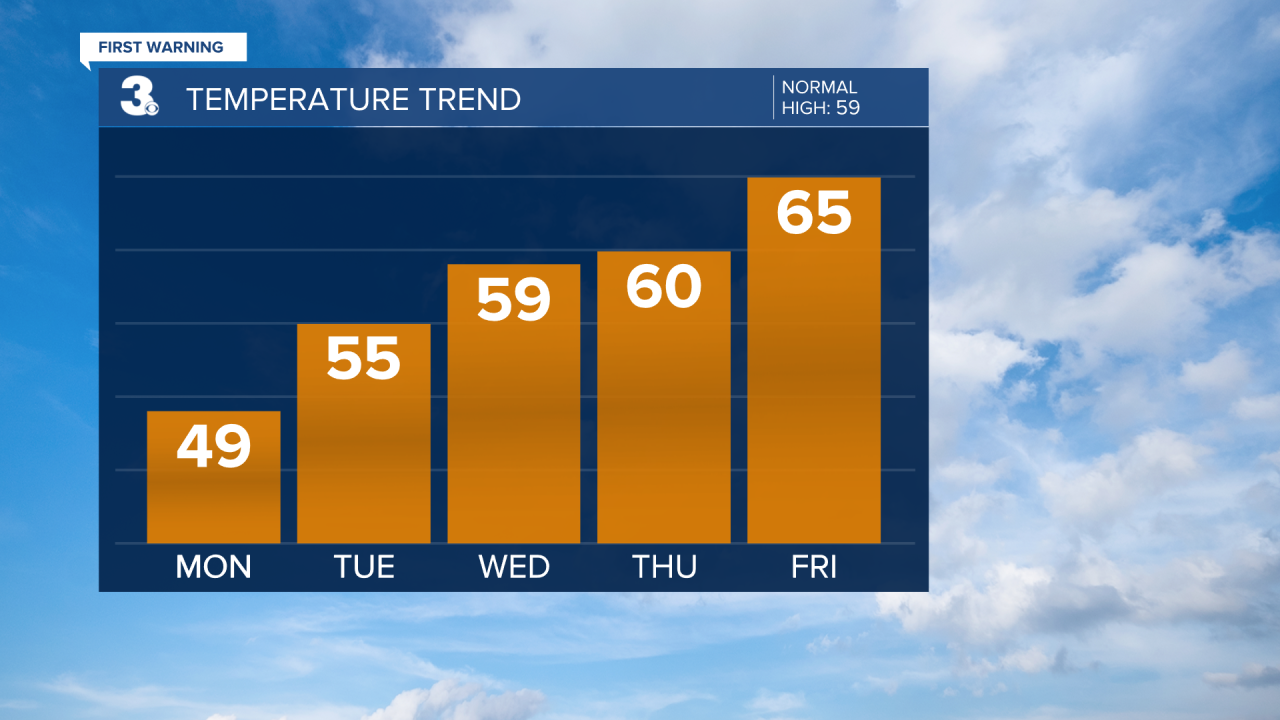 Most of us will top out in the upper 50s and lower 60s. Yet another cold front will move in on Monday, knocking our high temperatures down into the upper 40s under partly cloudy skies.