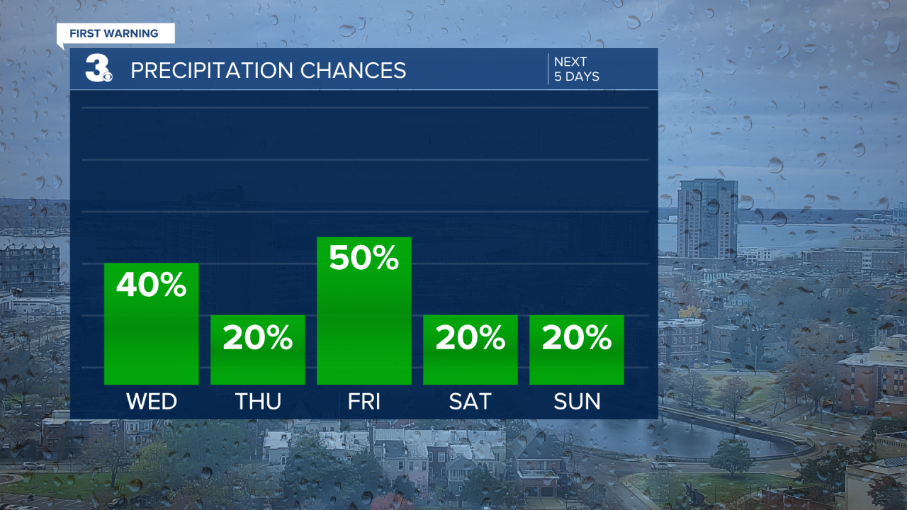 A cold front will bring more clouds and rain on Friday and a drop in temperatures. We expect to top out in the low-to-mid 50s, which is a few degrees below normal.