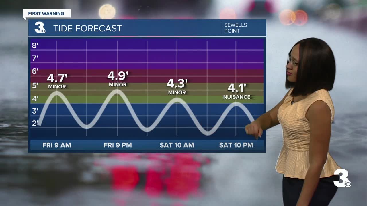 Our current tidal flooding is stemming from Hurricane Earl in the middle of the Atlantic and a weakening coastal low just offshore. Expect minor tidal flooding with 1 foot inundation during high tide cycles Friday. A Coastal Flood Advisory is in effect until 1 AM Saturday.