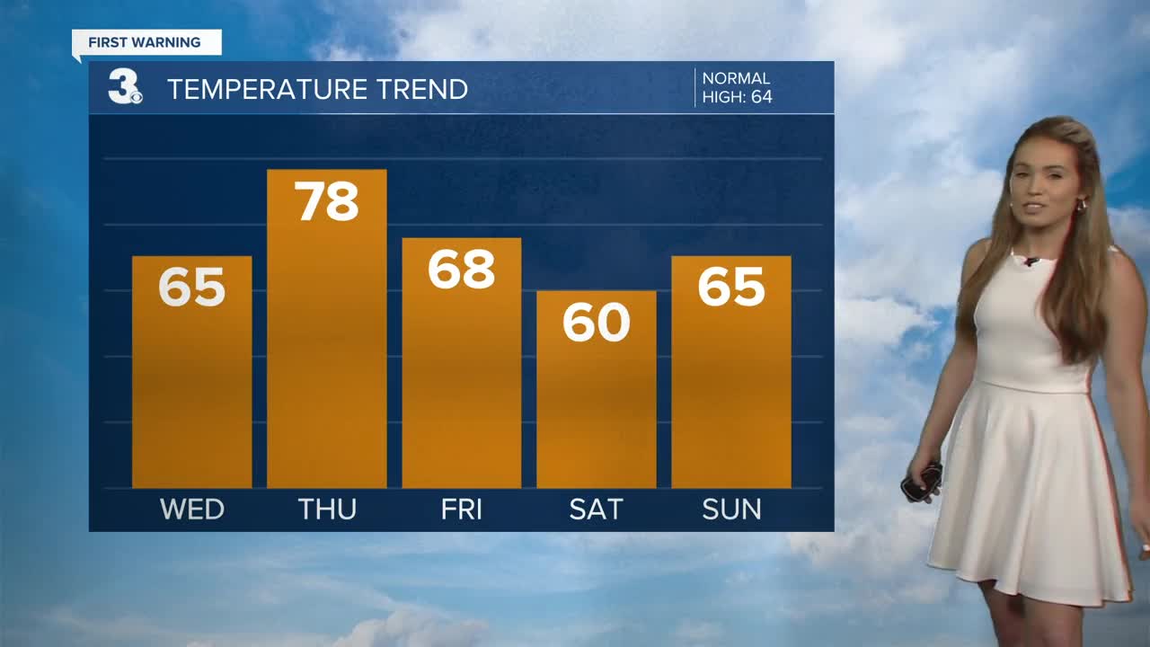Clearing skies and breezy conditions to end the work week. Temperatures will be about 10 degrees cooler with highs in the upper 60s.