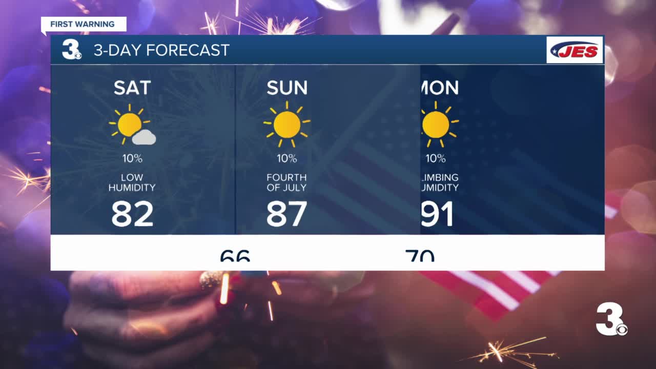 Lots of sunshine to kick off the Fourth of July. Temperatures will warm to the mid 80s, with fairly low humidity. Skies will continue to be mostly clear as you head out to see the fireworks. Temperatures will fall to near 70 overnight.
