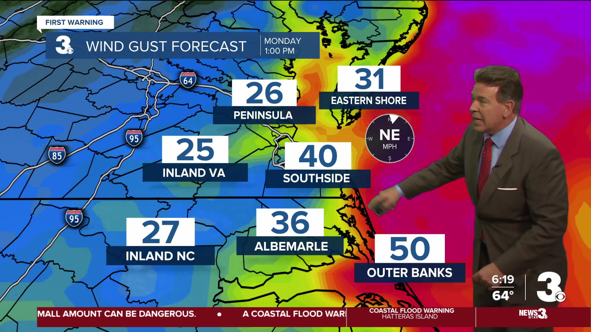 Gusts of wind should easily climb to 45 to 55 + mph, especially near and along the coast.