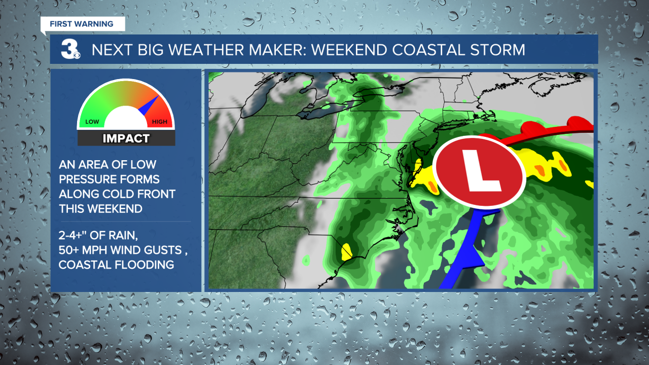 Since this storm is coming up from Florida, it will adversely affect Eastern North Carolina first and by Saturday morning. For Hampton Roads, for example, the worst part of this storm should unfold by late Saturday and Saturday evening (after dark) and through early Sunday morning, in terms of rainfall.