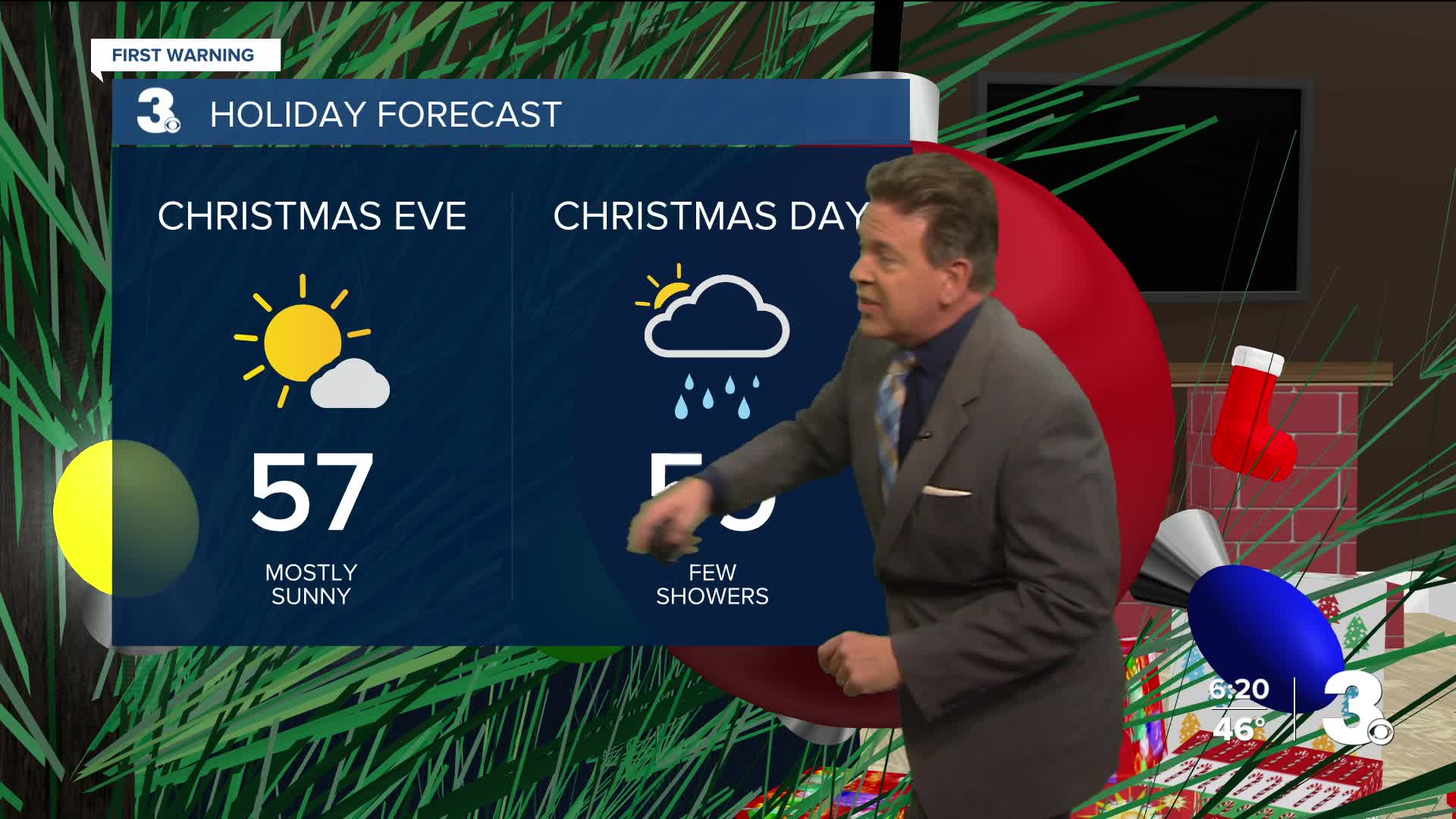 On Wednesday night, as Santa Claus is flying around, clouds will increase and some pockets of rain, a 30% chance, will move into Hampton Roads and Northeast North Carolina by Christmas Day.