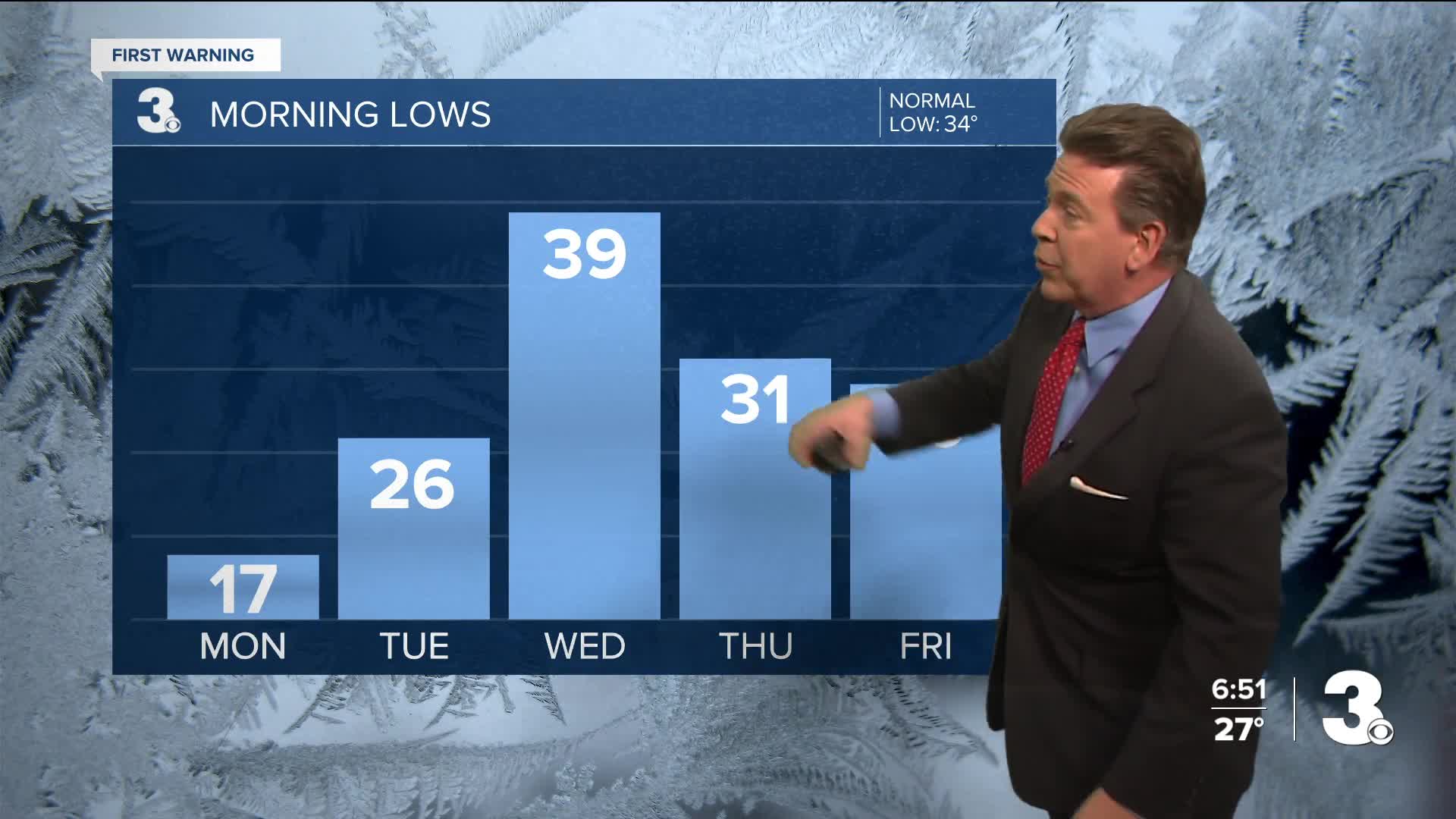 Monday night, more clouds roll in with lows in the mid 20s.